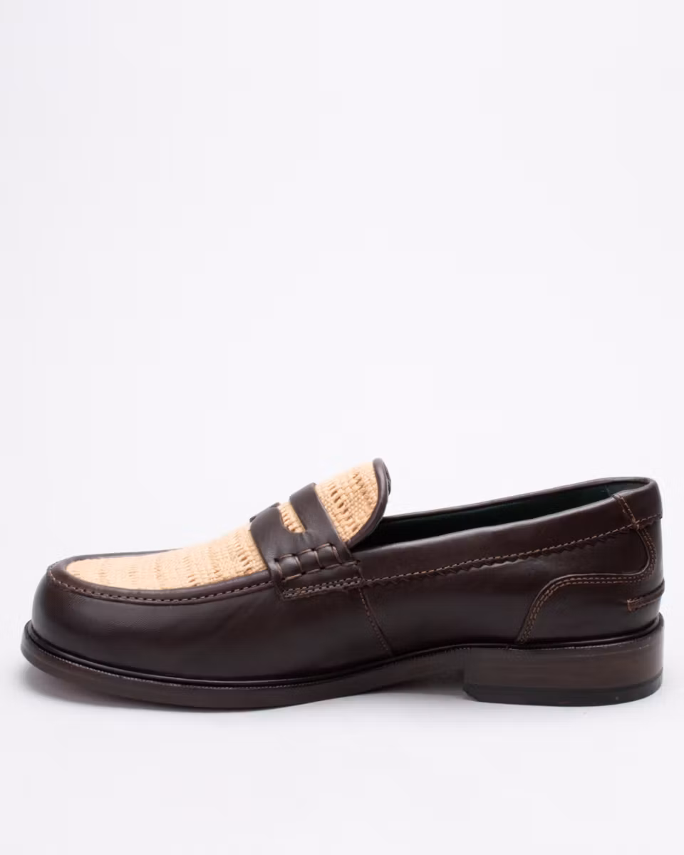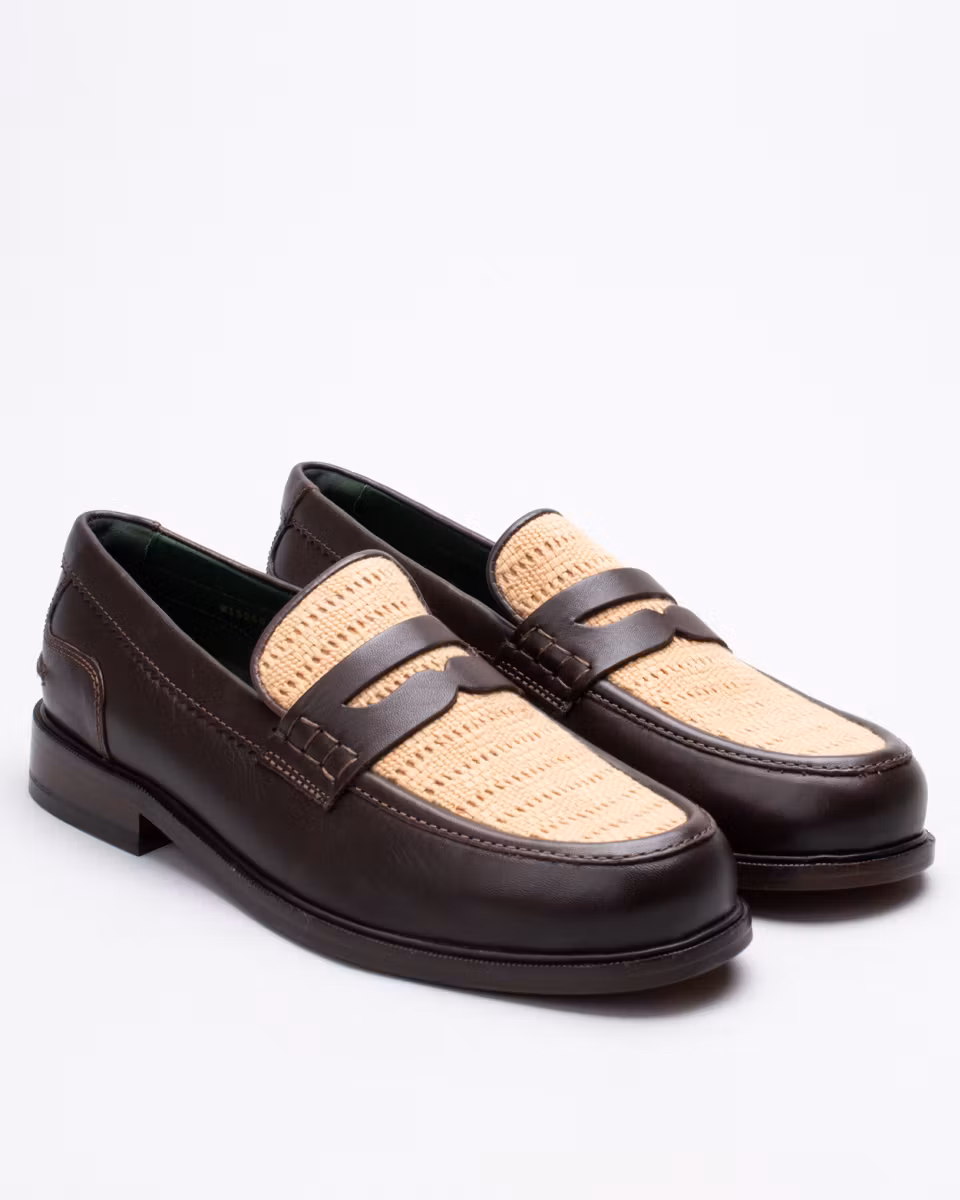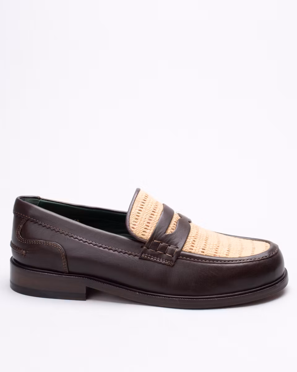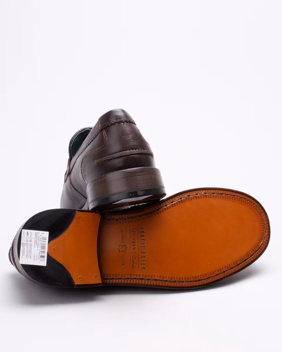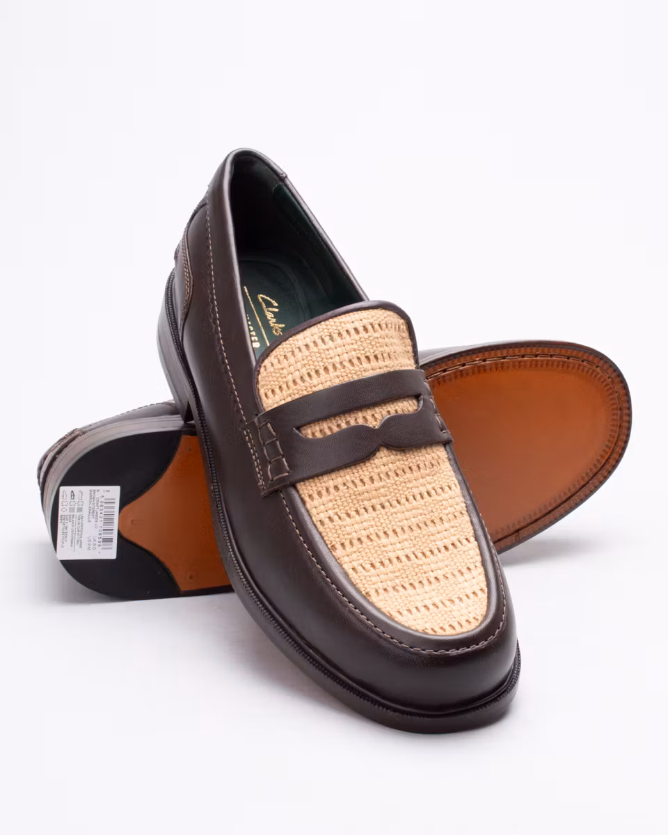 Classic penny loafer from Clarks. Upper in dark brown calf leather with woven textile. Fully leather lined. Leather-covered, cushioned insole. Leather outsole. Blake-stitched construction. Made in India.