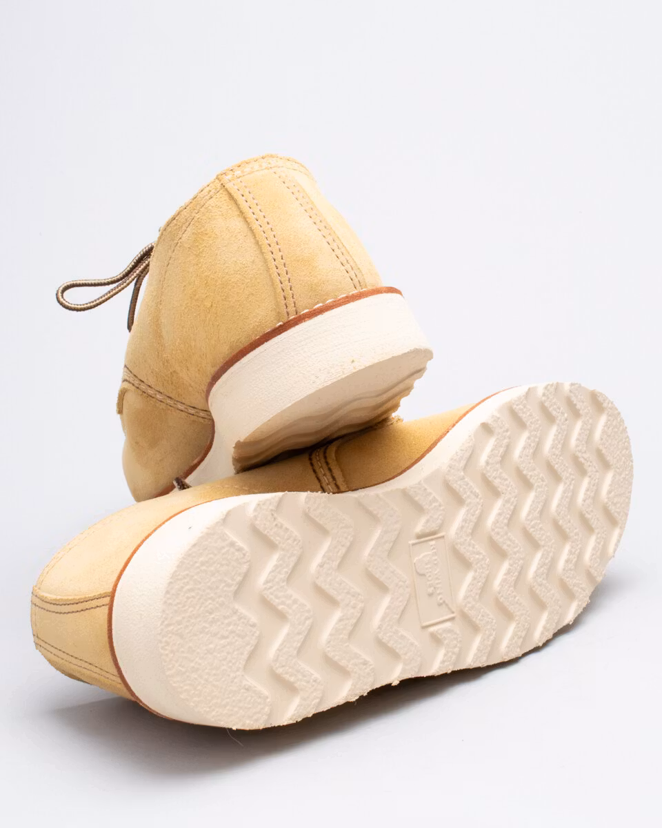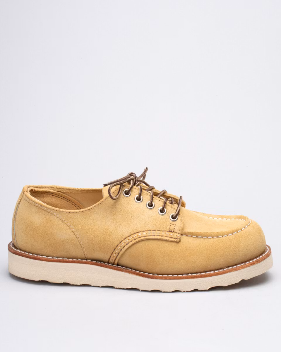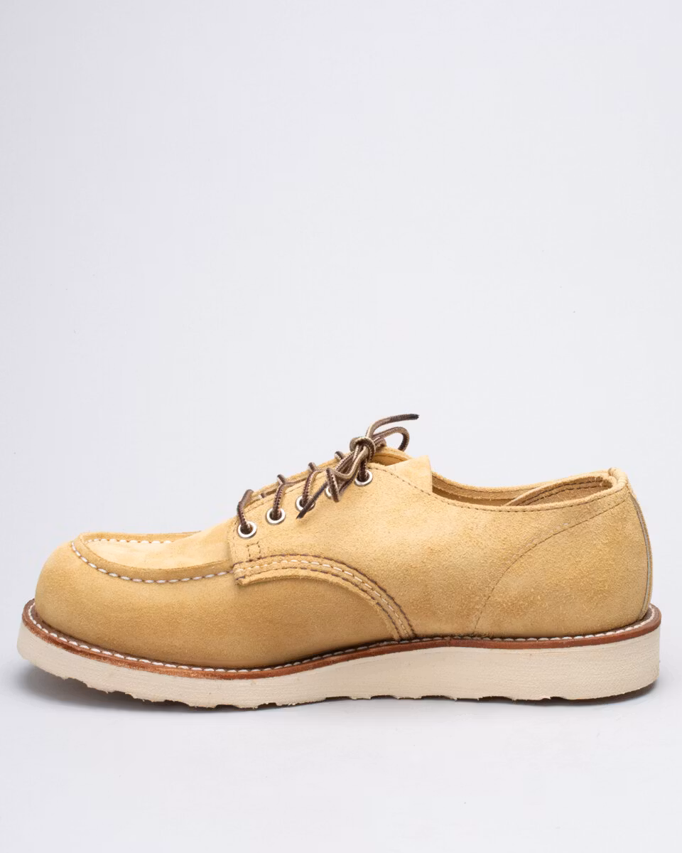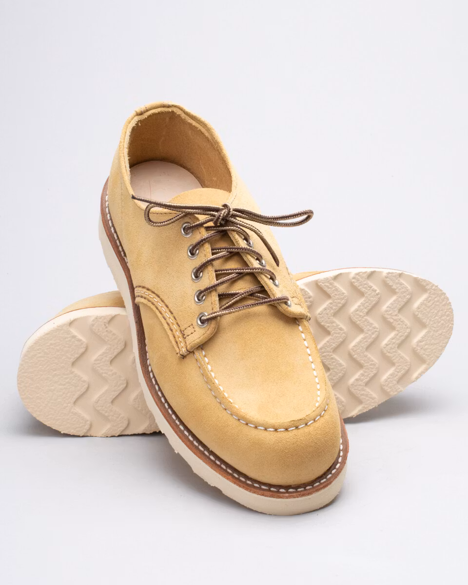 Red Wing Shoes Moc Oxford made its debut in 1954. Upper in rough-out hawthorne suede. Leather lining. Leather insole. Puritan triple stitched quality upper. Red Wing Shoes classic white wedge rubber outsole. Goodyear welted construction. Made in USA. Normal width, D.