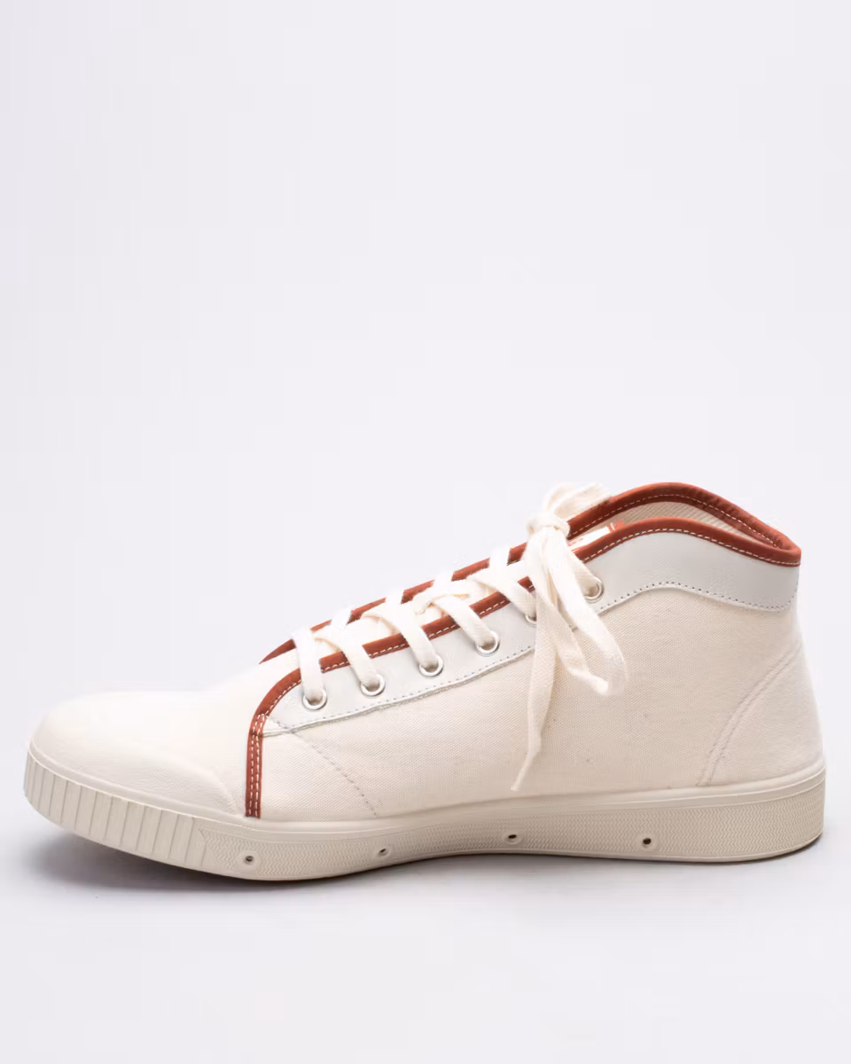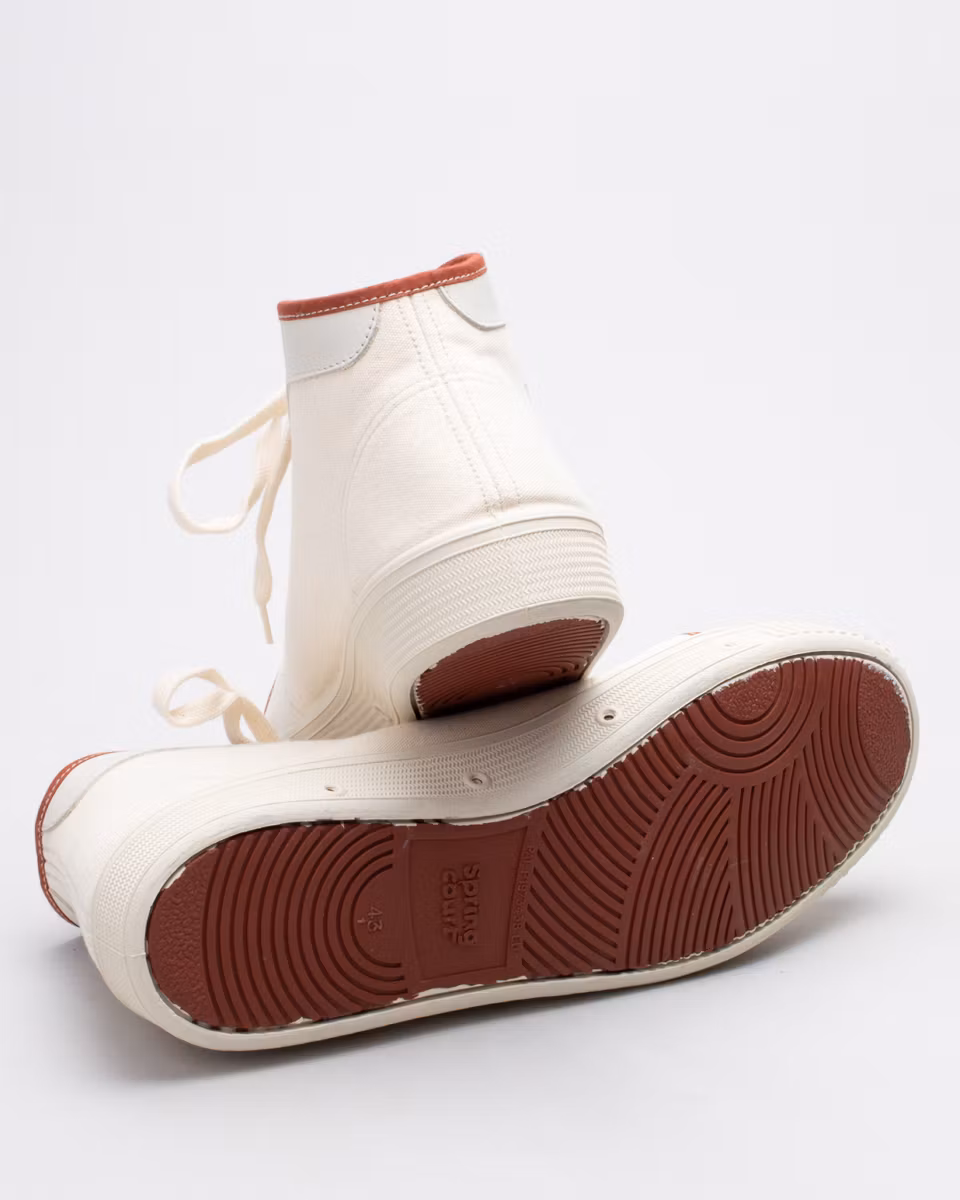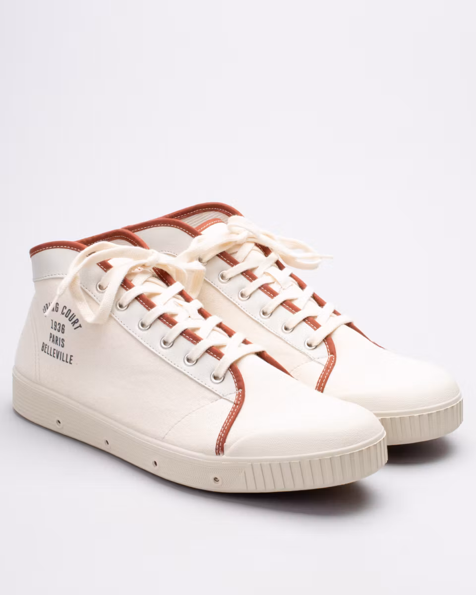 Off white canvas upper with grey leather details. Removable insole. Rubber outsole. Made in Spain.