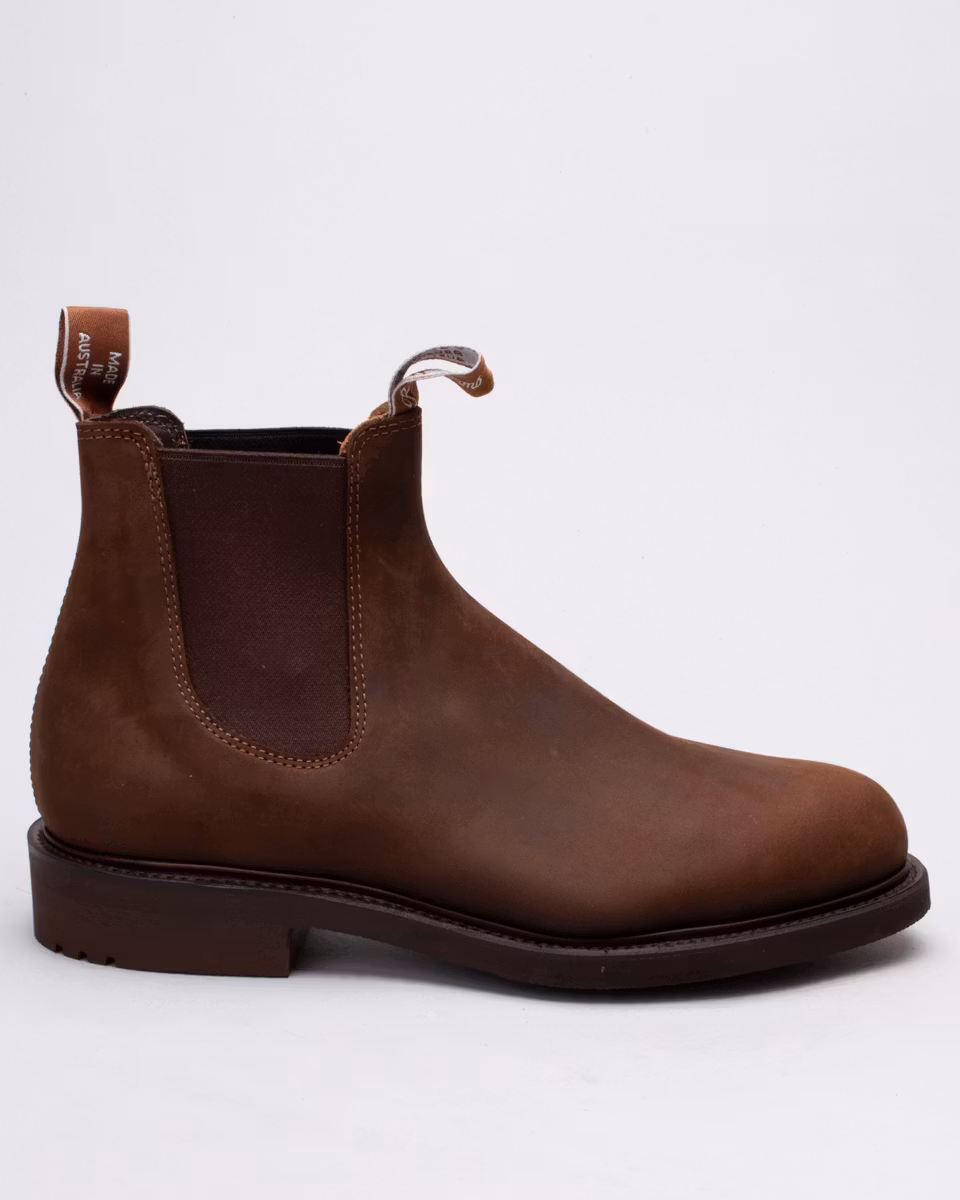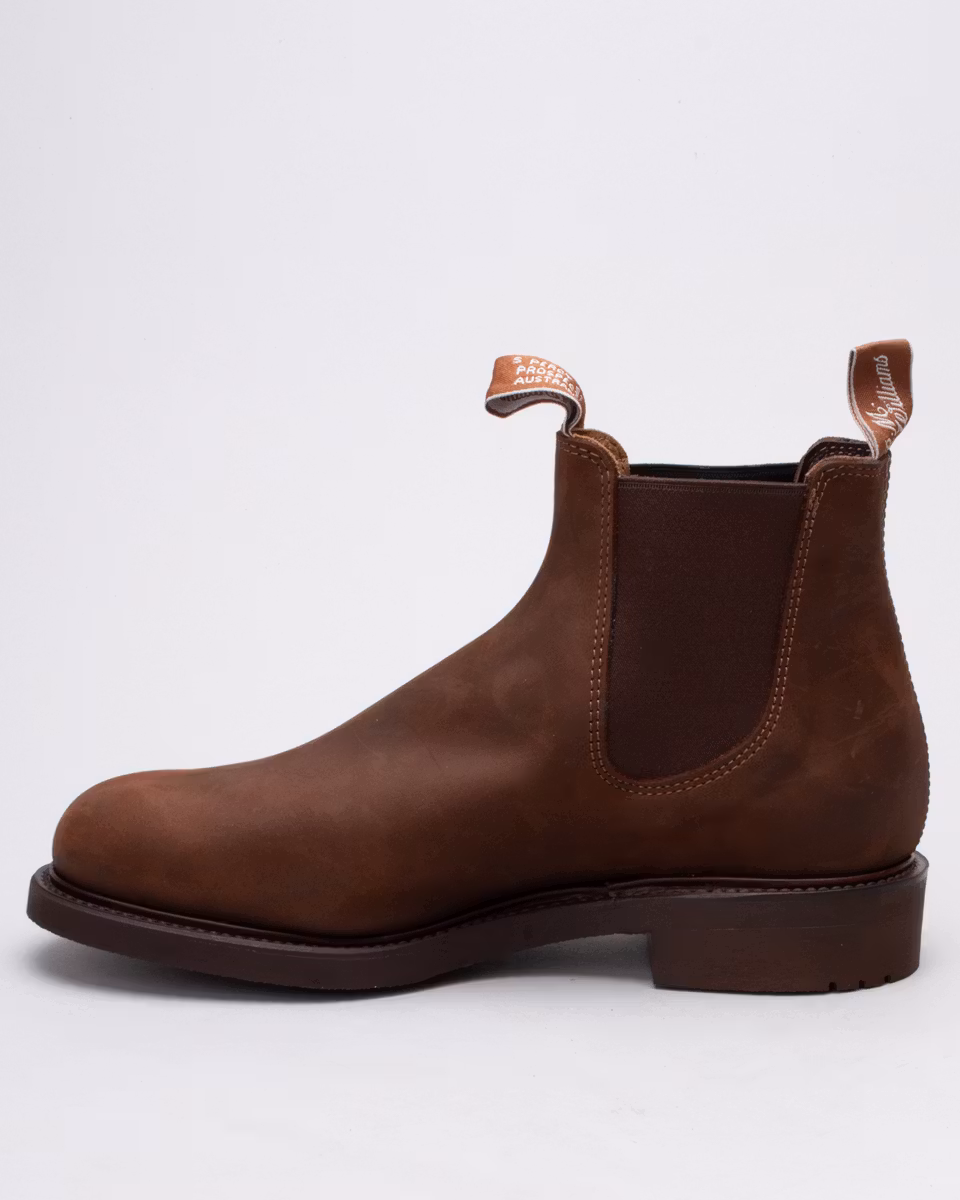 R.M. Williams Comfort Gardener. Ovandel i brunt, oljat fullnarvsläder. Fullt skinnfodrad. Komfortinnersula. Mönstrad yttersula i gummi. Randsydd konstruktion med storm-welt. Normalbred läst, G. Hantverksmässigt tillverkad i Australien.