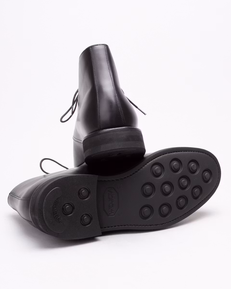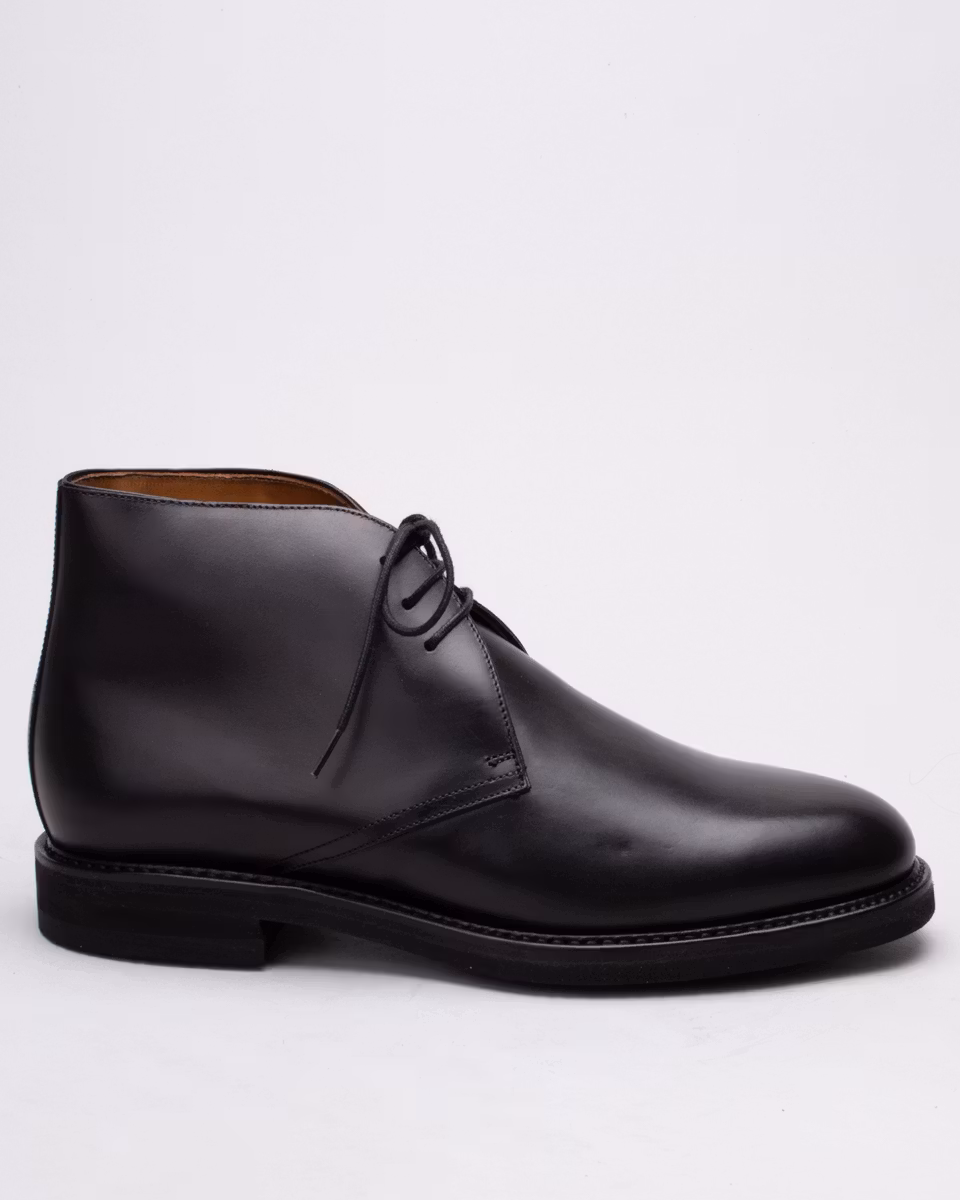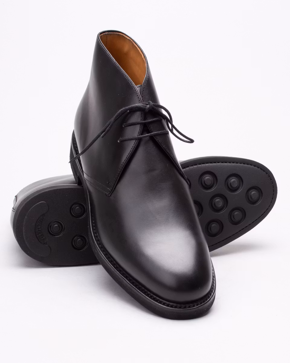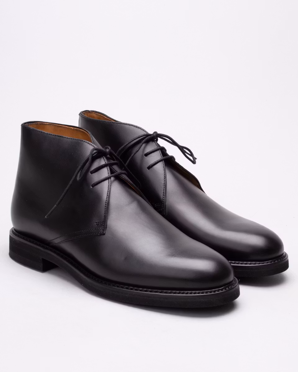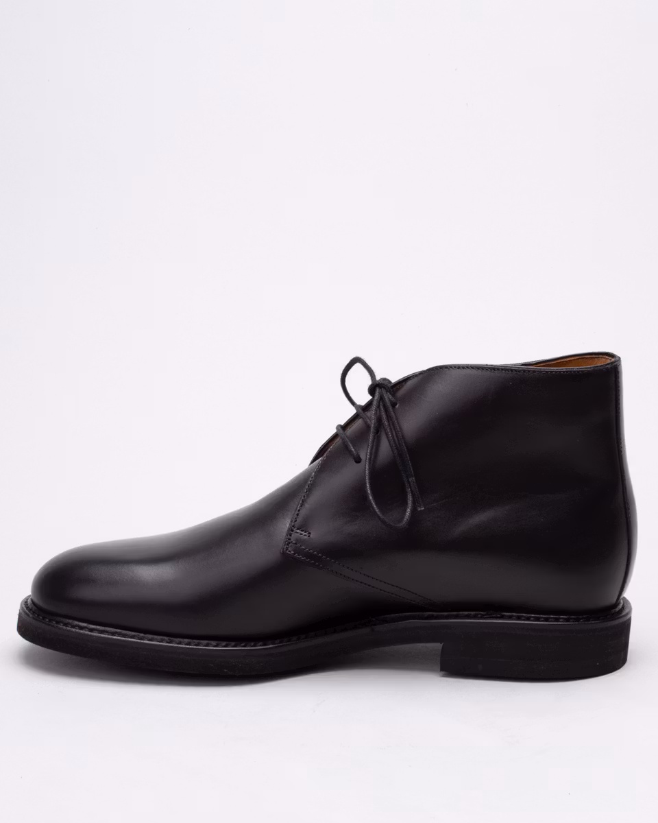 3-håls chukka från Berwick. Ovandel i svart kalvskinn. Fullt skinnfodrad. Innersula i läder. Vibram® Eton yttersula i gummi. Randsydd konstruktion med storm welt. Hantverksmässigt tillverkad i Spanien. Läst: 207