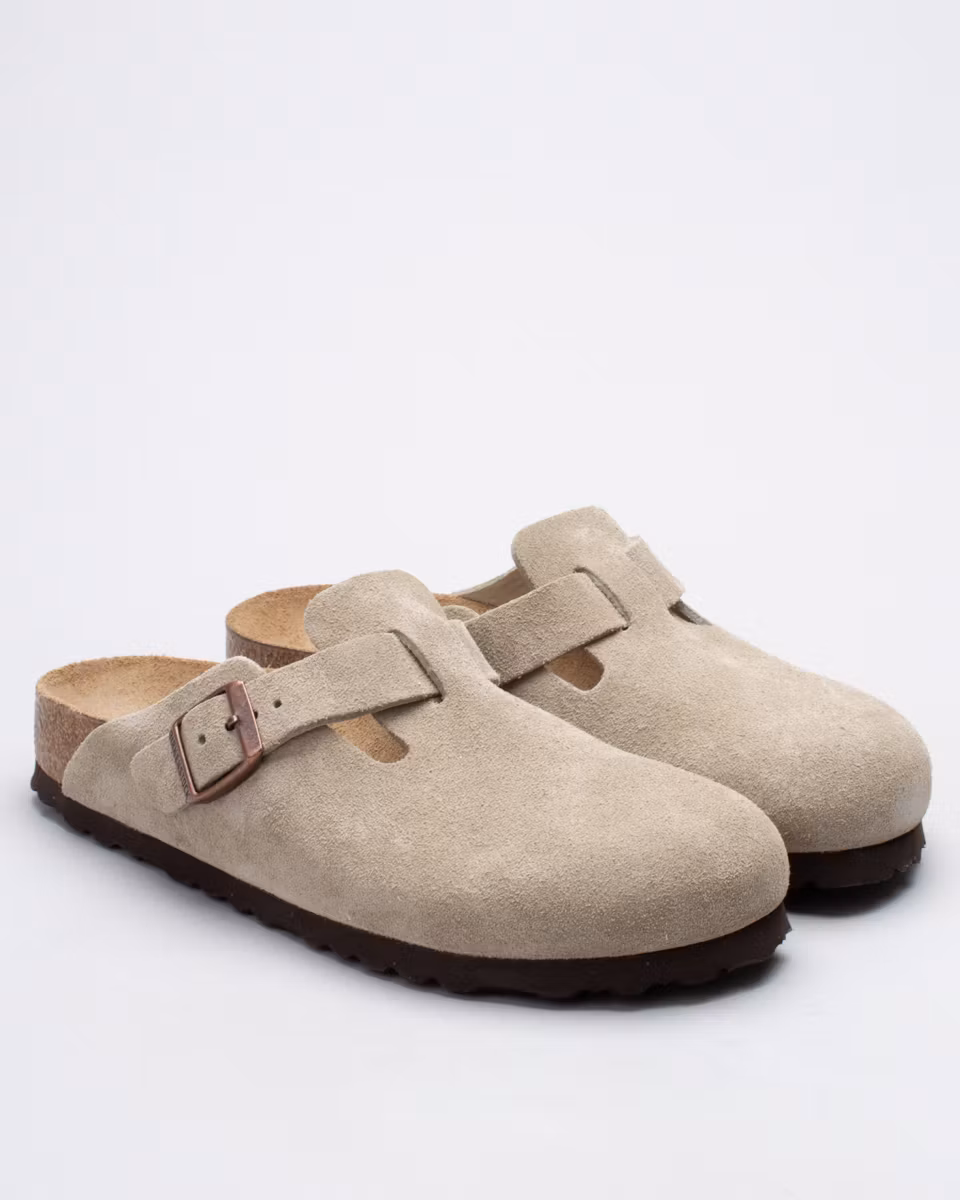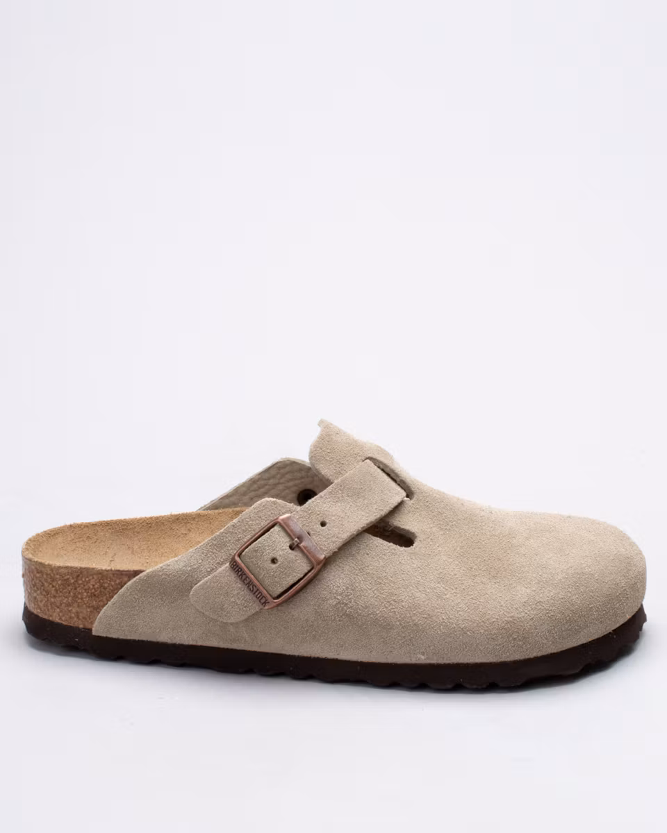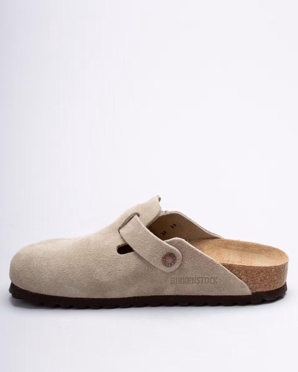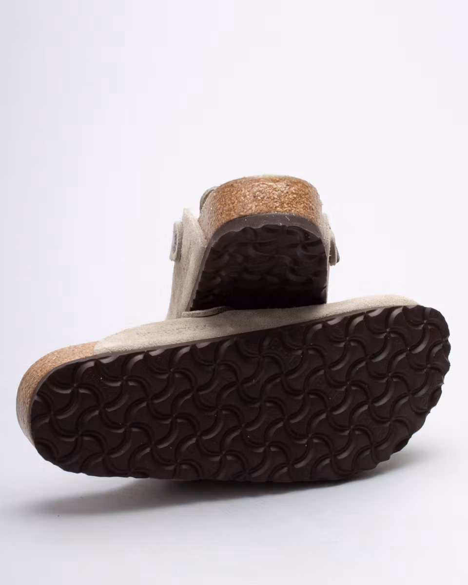Birkenstocks heltäckta sandal, Boston. Ovandel i gråbeige mocka. Läderklädd fotbädd av kork. Yttersula i EVA-gummi. Smal läst. Tillverkad i Tyskland.