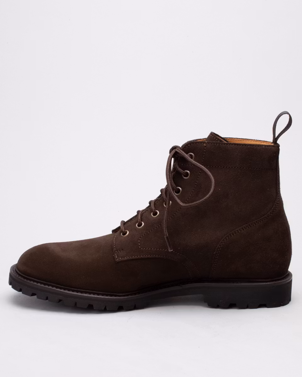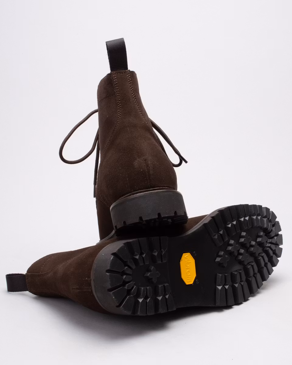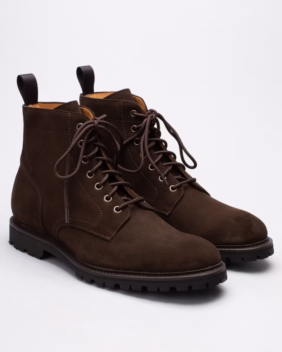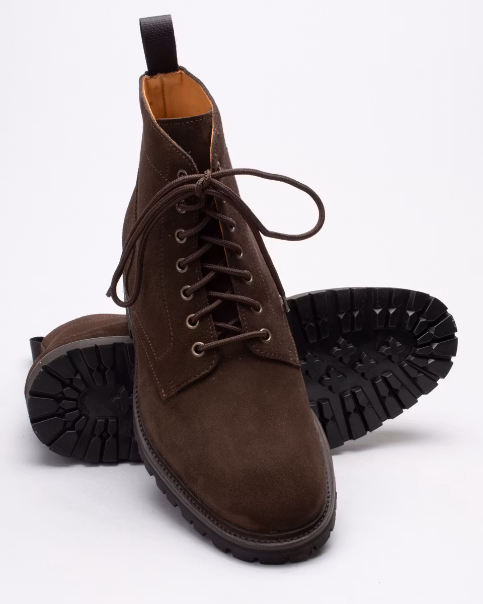 Kraftig derbykänga med slät tå från Berwick. Ovandel i mörkbrun kvalitétsmocka från C.F. Stead Tannery. Fullt skinnfodrad. Innersula i läder. Vibrams grovmöstrade Montagna-sula i gummi. Randsydd konstruktion med storm-welt. Tillverkad i Spanien.