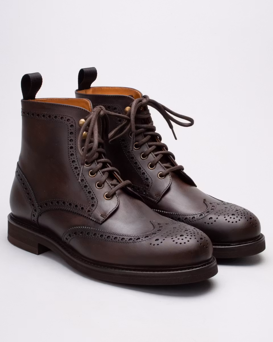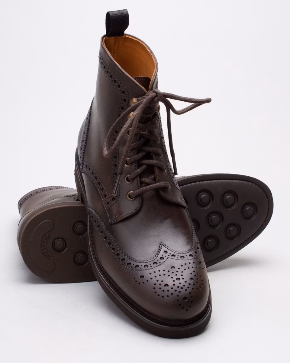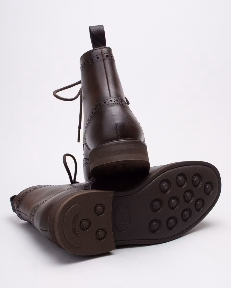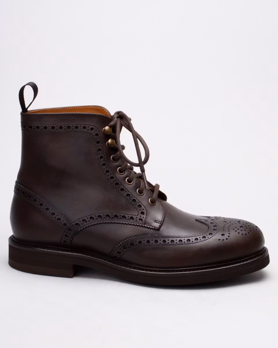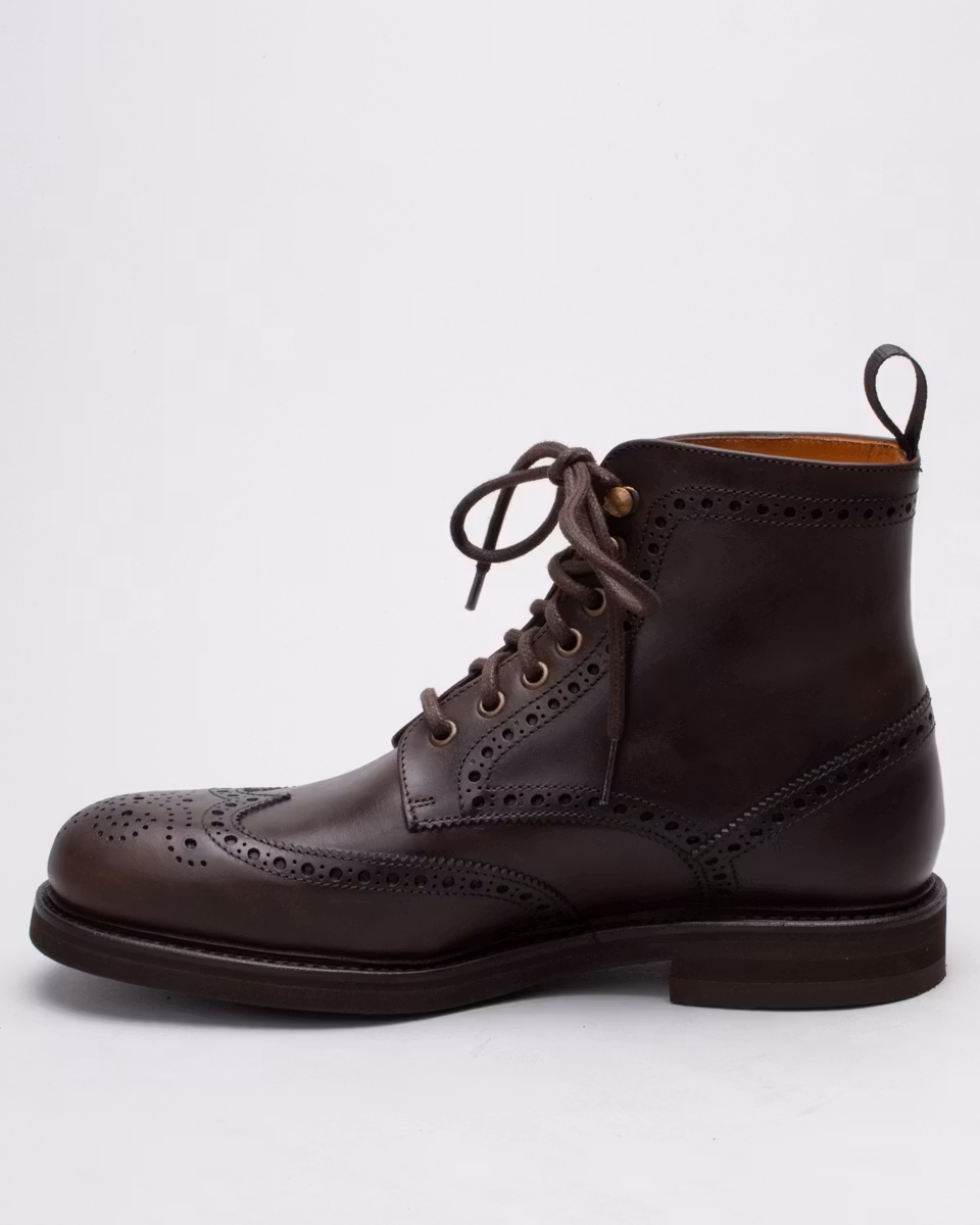 Derby-känga med brogue-mönster från Berwick 1707. Ovandel i mörkbrunt, oljat fullnarvsläder. Fullt skinnfodrad. Innersula i läder. Vibram® Eton yttersula i gummi. Randsydd konstruktion med storm-welt. Tillverkad i Spanien. Läst: HO768