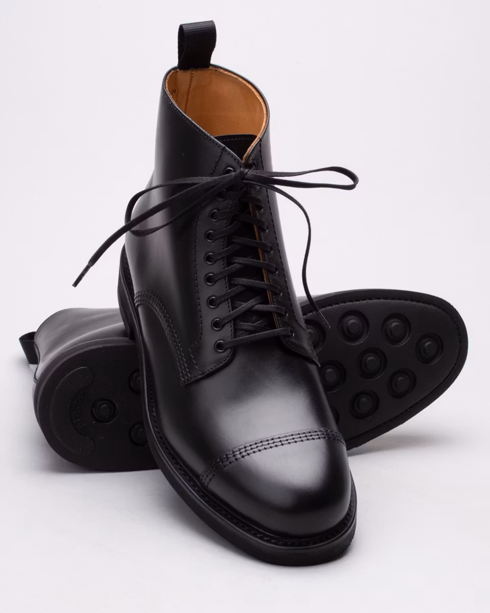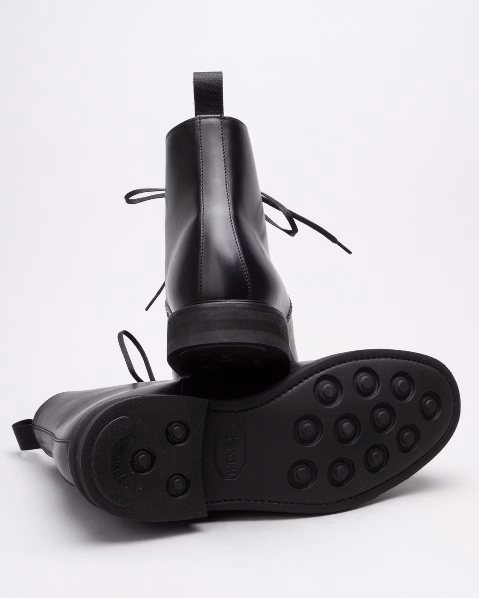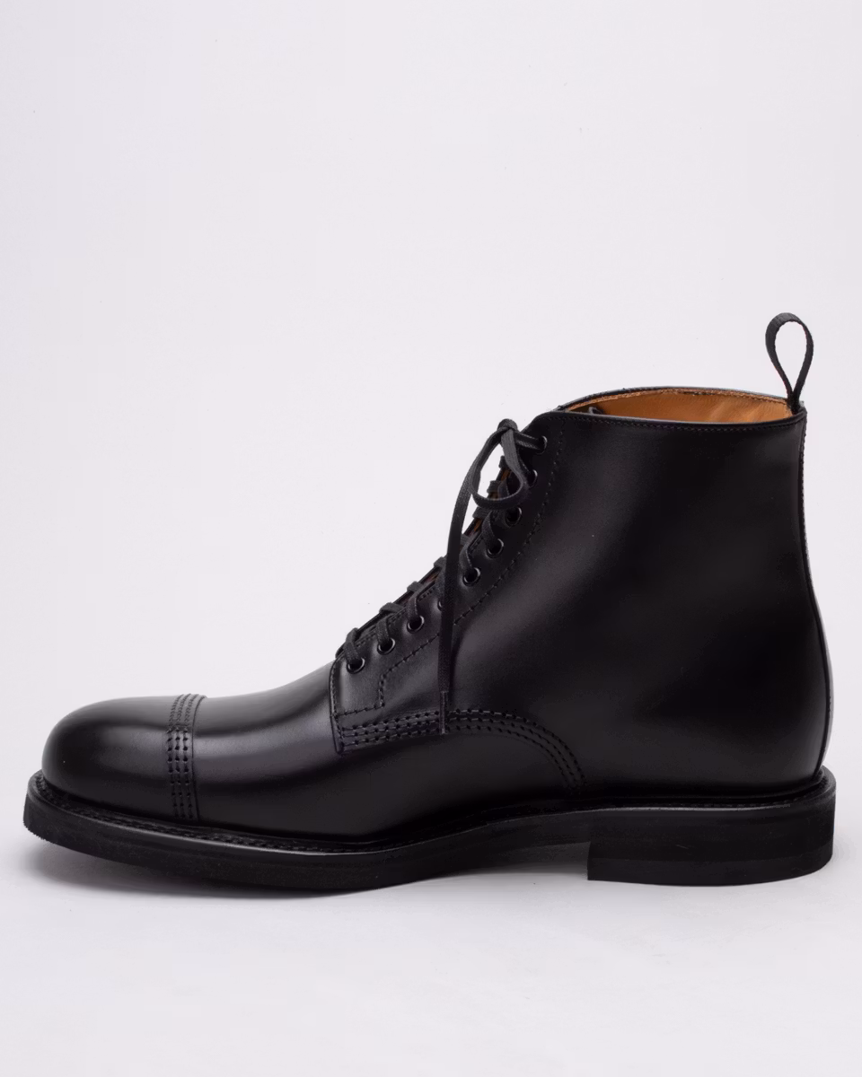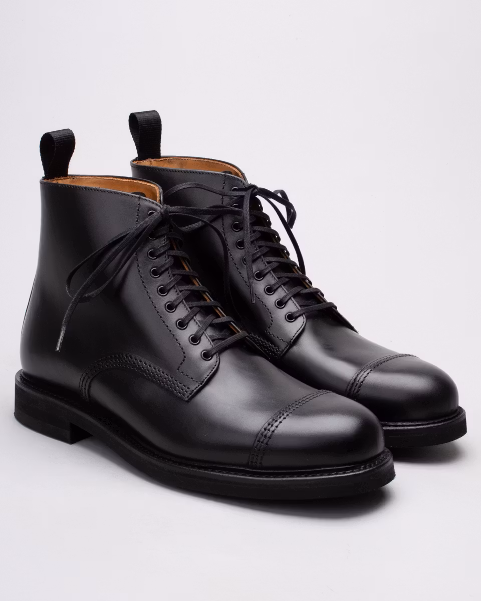 Derby-känga med cap-toe. Ovandel i svart kalvskinn. Fullt skinnfodrad. Innersula i läder. Vibram® Eton yttersula i gummi. Randsydd konstruktion med storm-welt. Tillverkad i Spanien. Läst: HO768