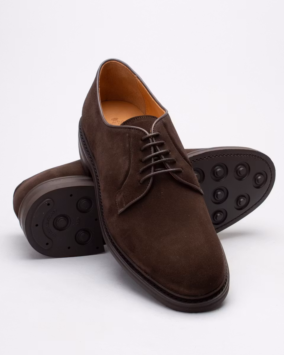 Klassisk derby i mörkbrun kvalitetsmocka från C.F. Stead. Innersula i läder. Yttersula i gummi från Dainite. Fullt skinnfodrad. Randsydd konstruktion med storm welt. Hantverksmässigt tillverkad i Spanien. Läst: Ho234