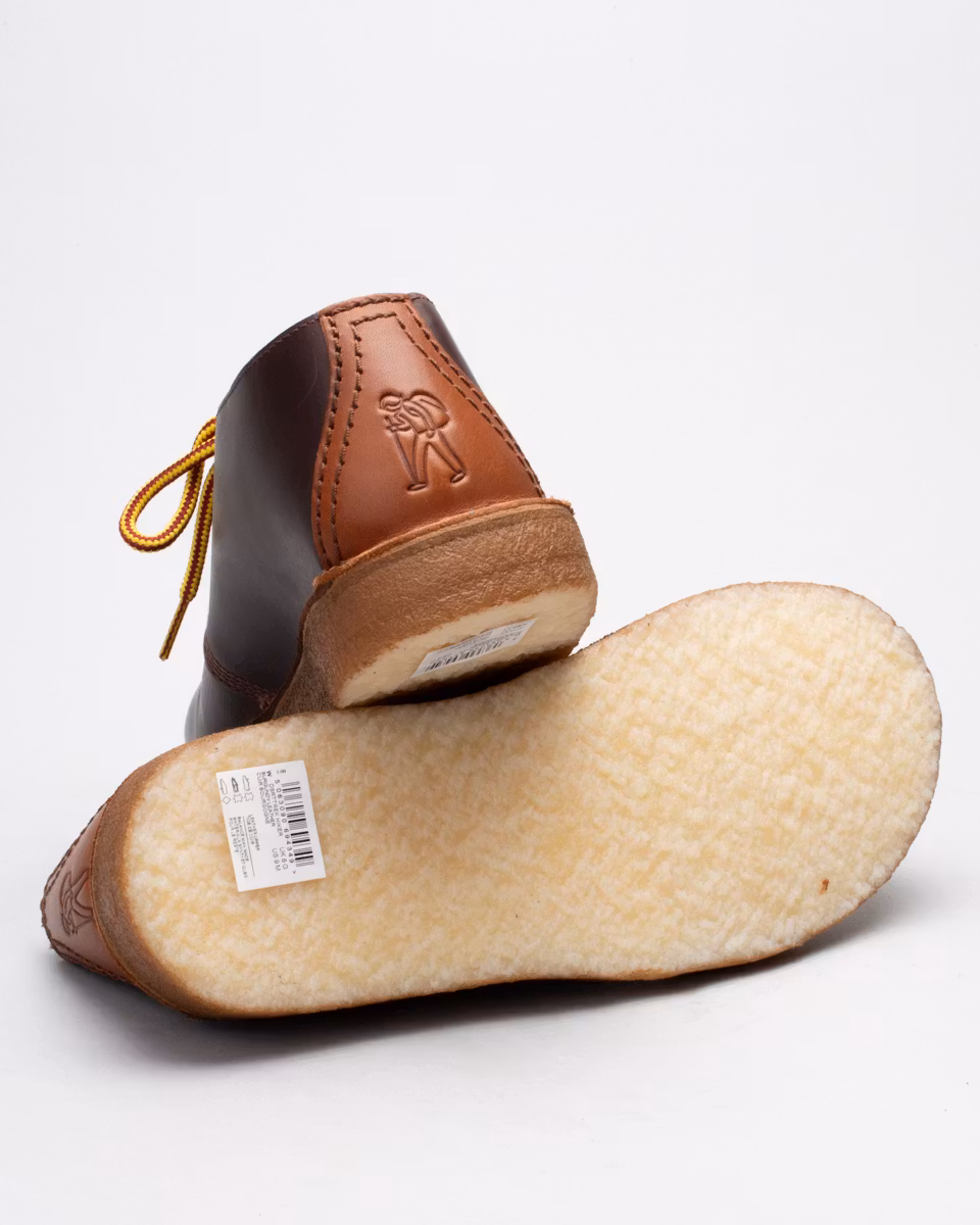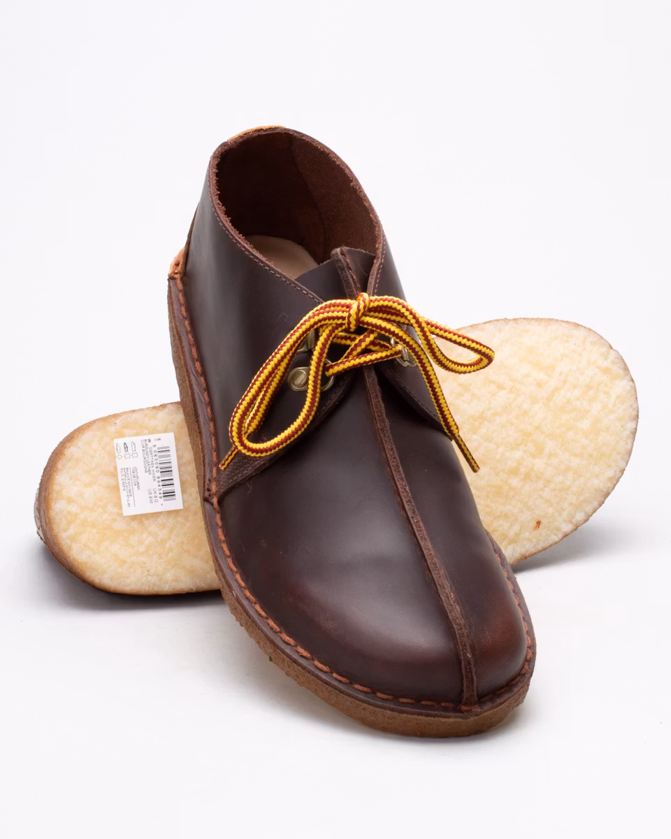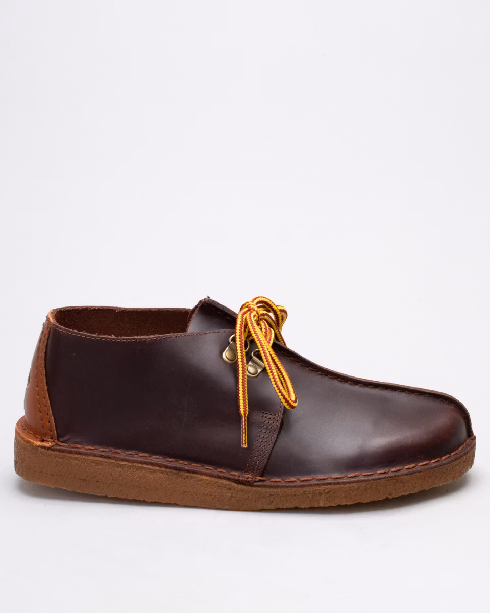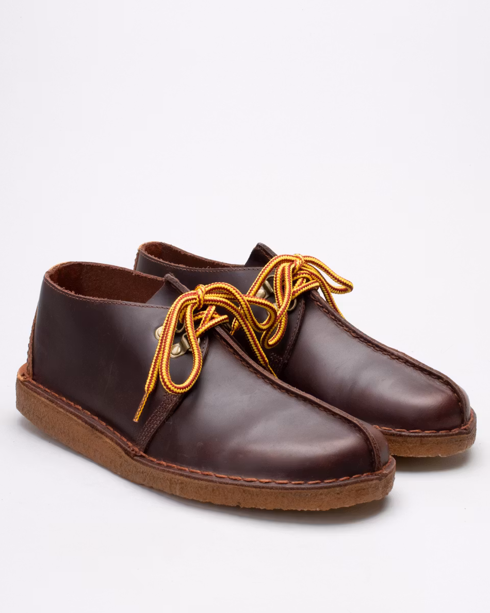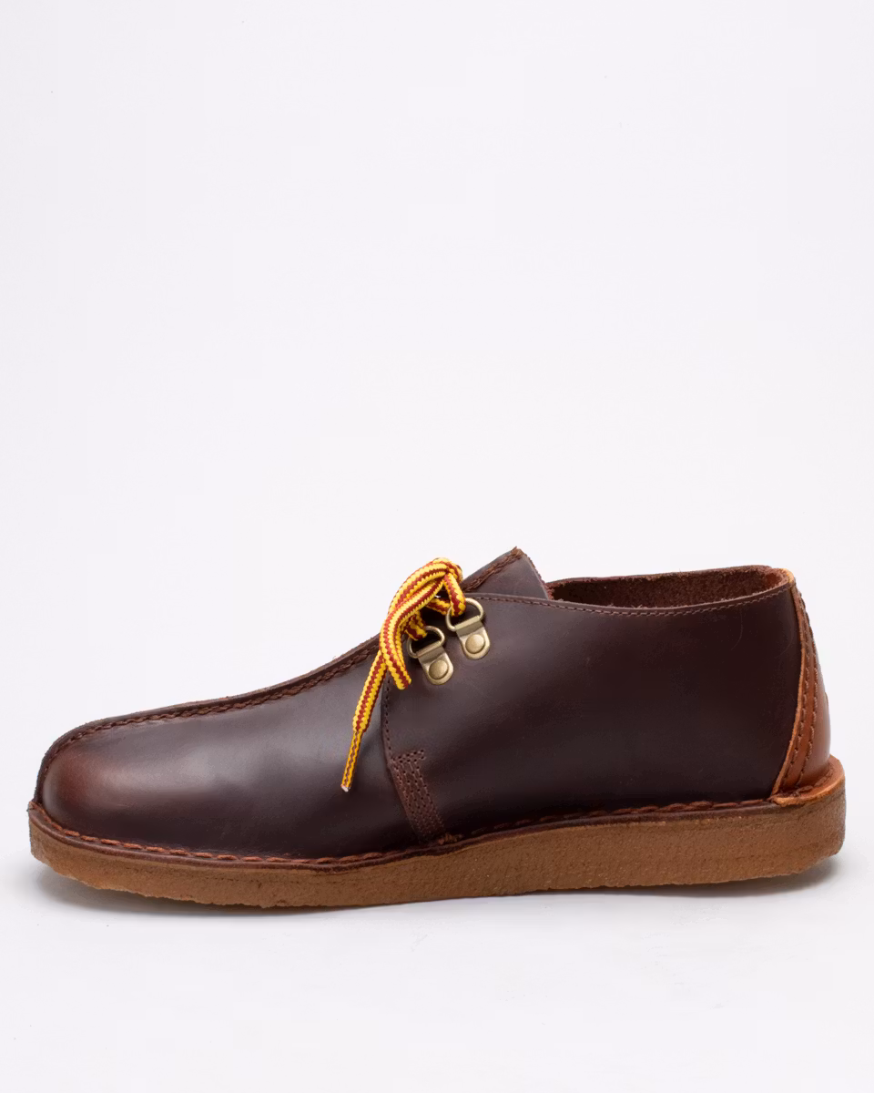 Clarks klassiker Desert Trek i hikingsko-inspirerat utförande. Ovandel i brunrött fullnarvsläder. Innersula i läder, yttersula i rågummi. Gulbruna och helbruna bomullsremmar medföljer.