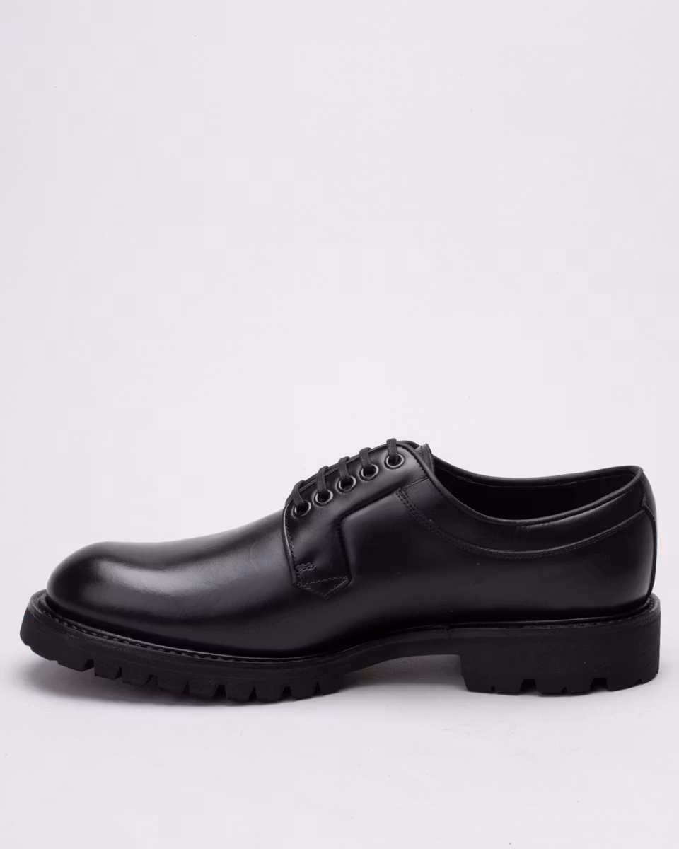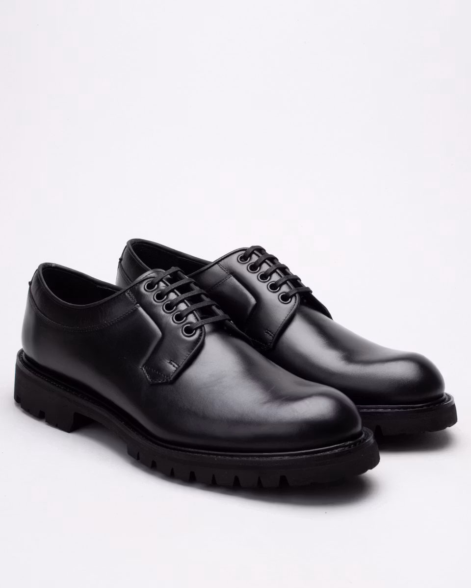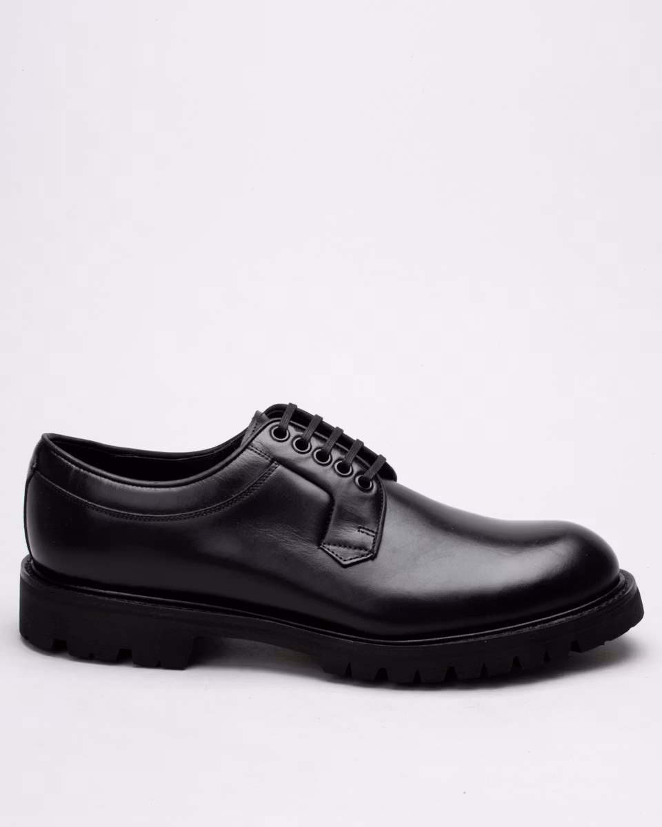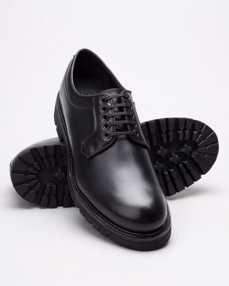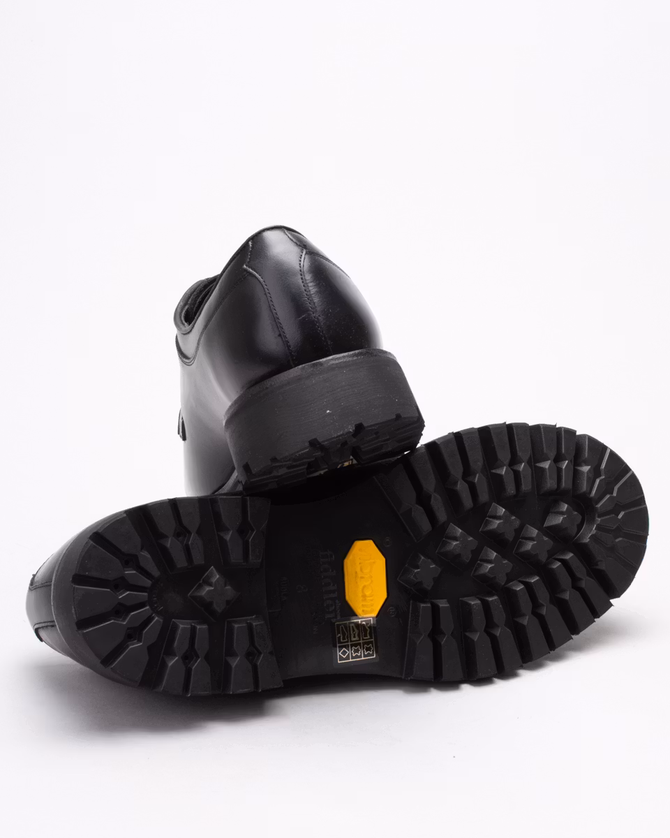 Klassisk derby med slät tå från Fiddler. Ovandel i svart nötläder. Fullt skinnfodrad. Innersula i läder. Gummiklädd yttersula i läder. Randsydd konstruktion med storm-welt. Hantverksmässigt tillverkad i Spanien.