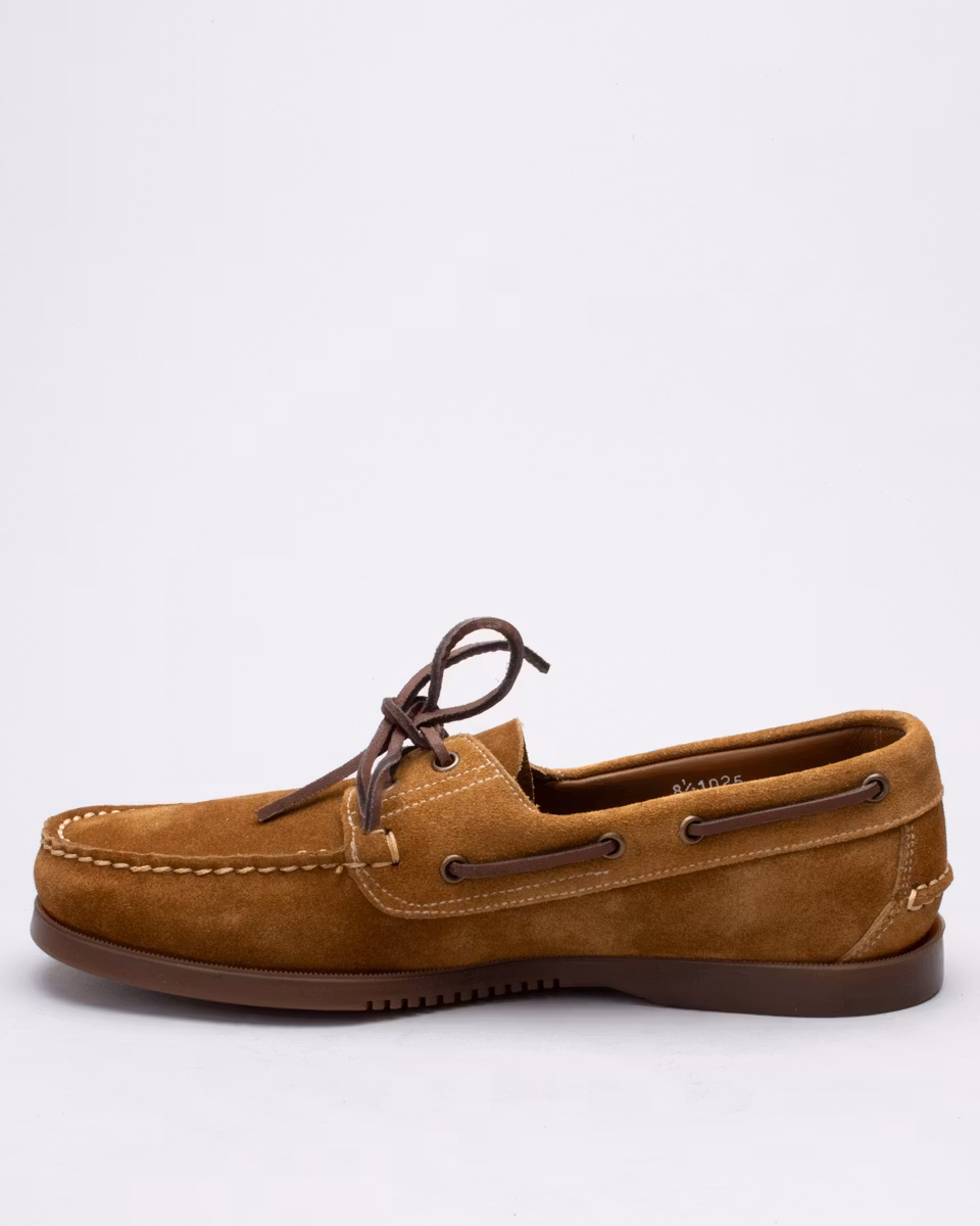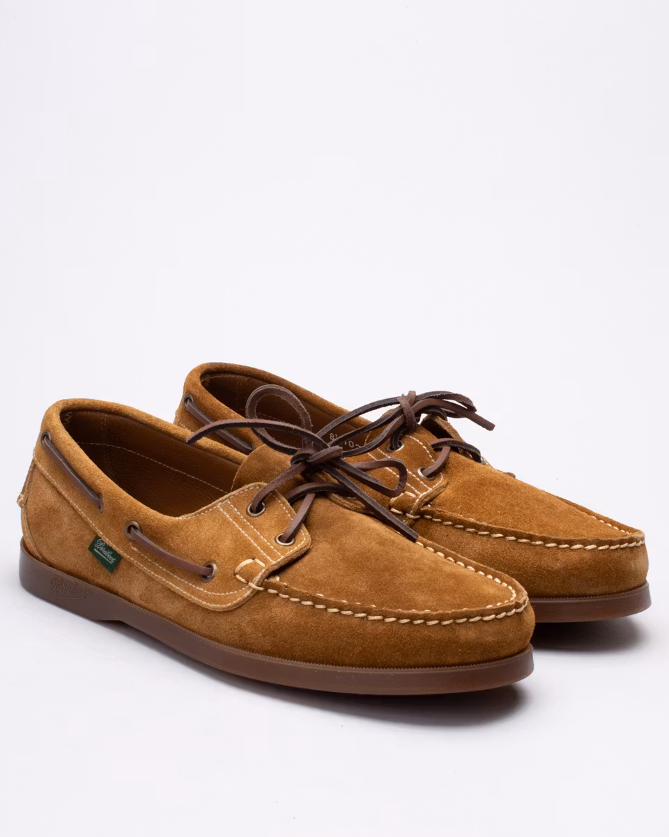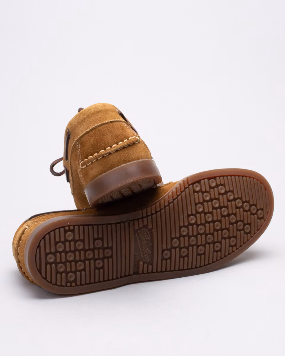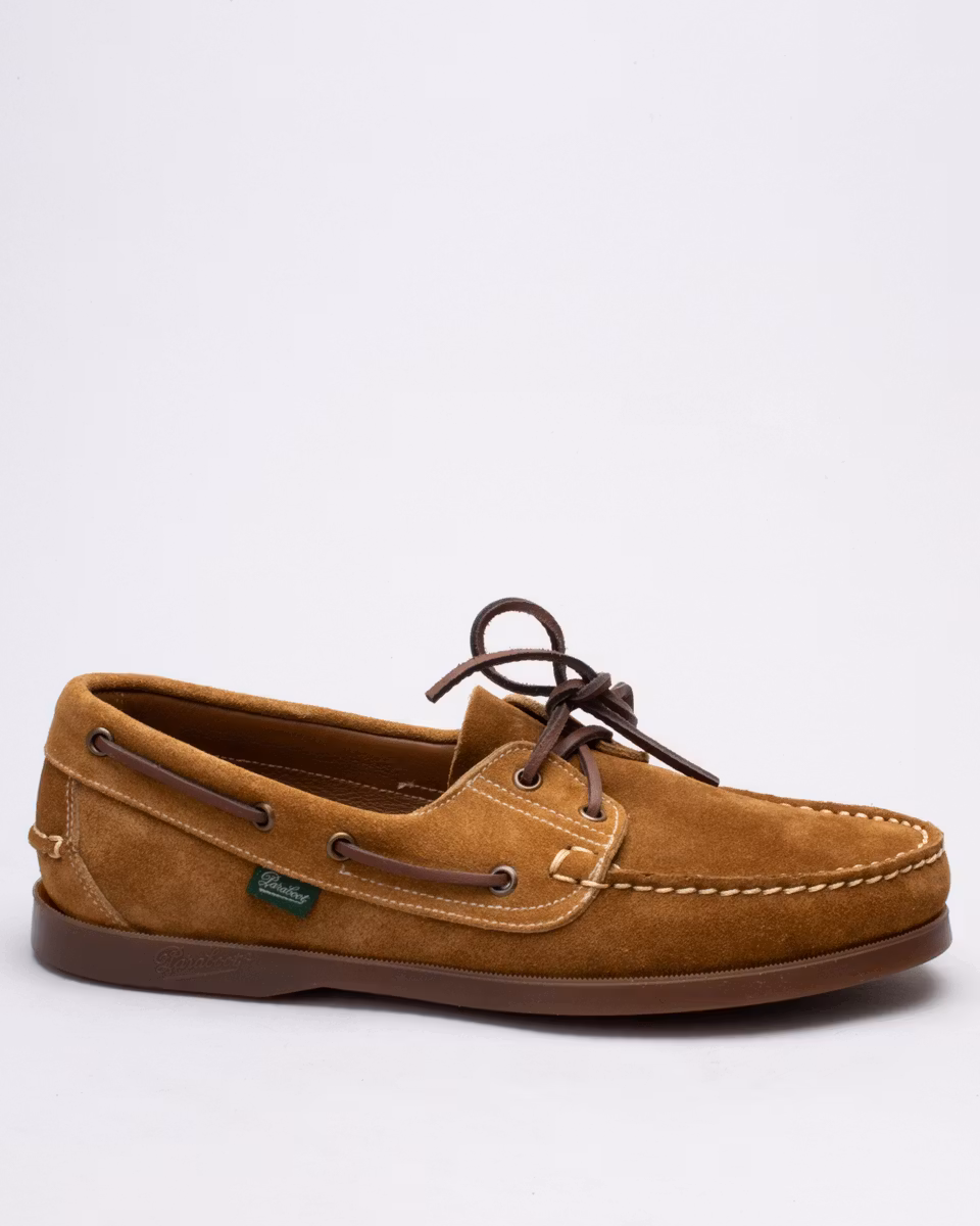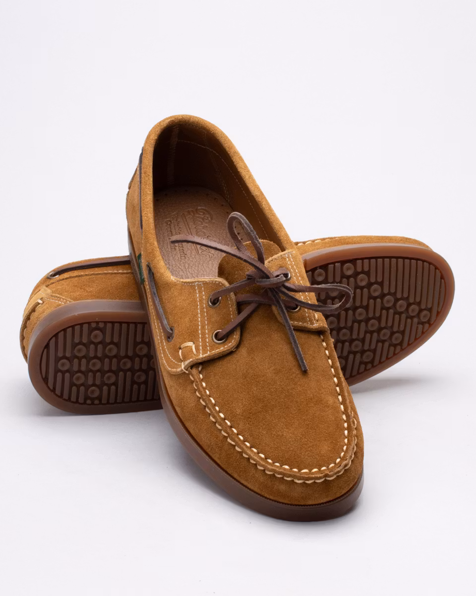 Paraboots seglarsko Barth. Ovandel i rådjursbrun mocka. Fullt skinnfodrad. Innersula i läder. Yttersula i gummi. Läderremmar. Durksydd konstruktion. Tillverkad i Spanien.