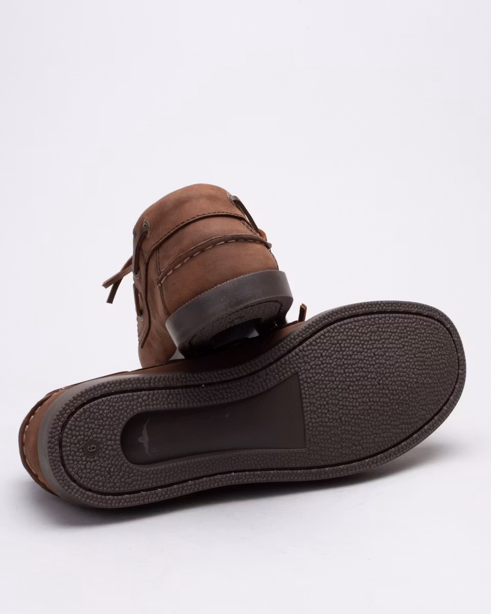 Seglarsko från R.M. Williams. Ovandel mörkbrun nubuck. Ofodrad. Läderklädd innersula. Yttersula i gummi. Durksydd konstruktion. Tillverkade i Portugal.
