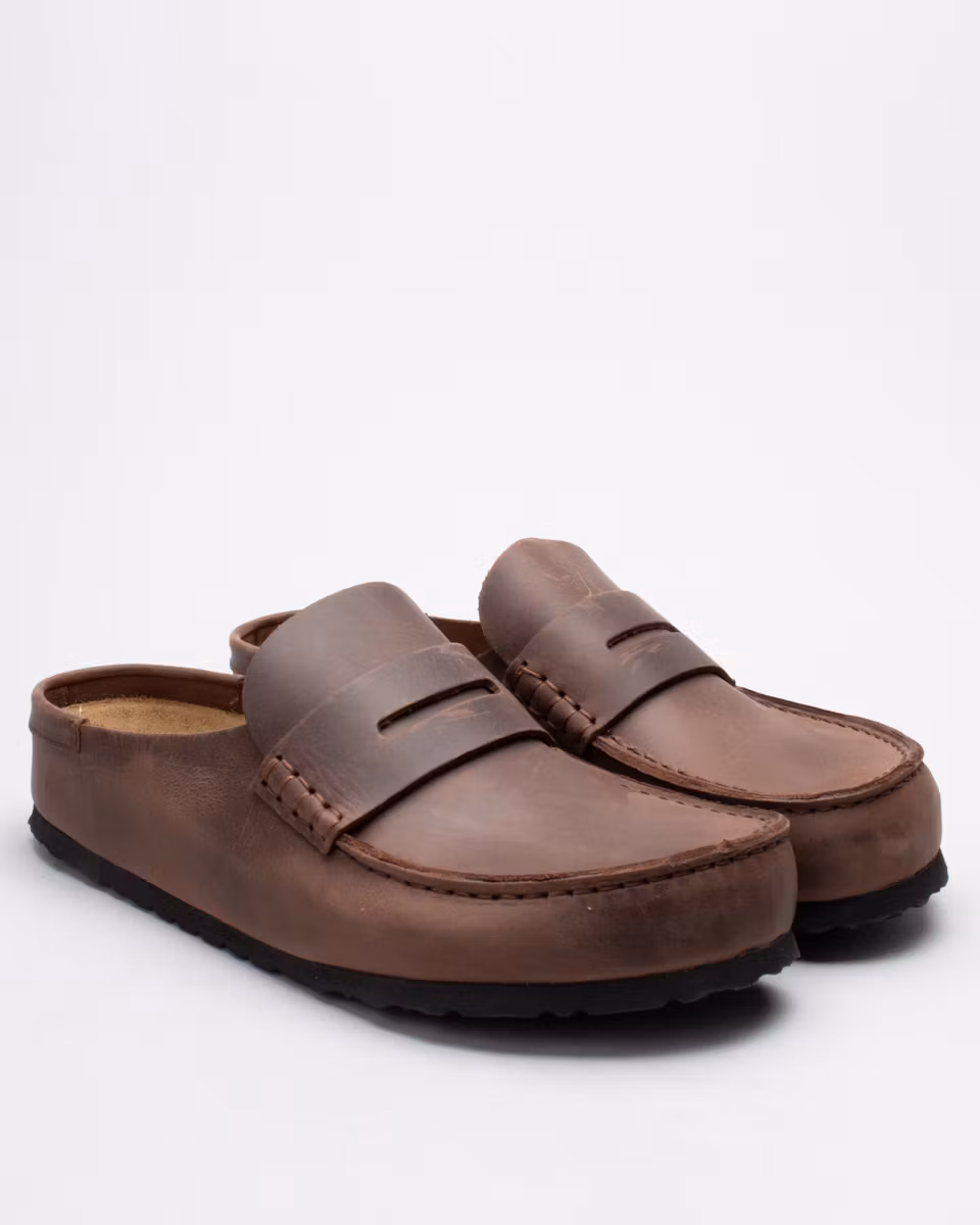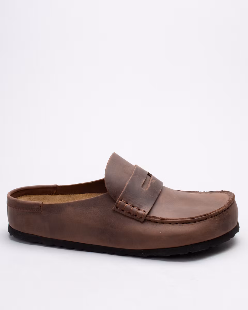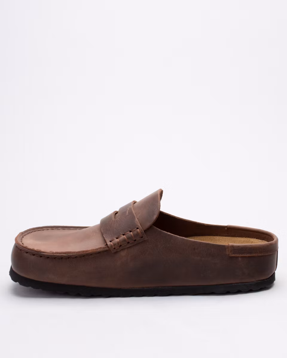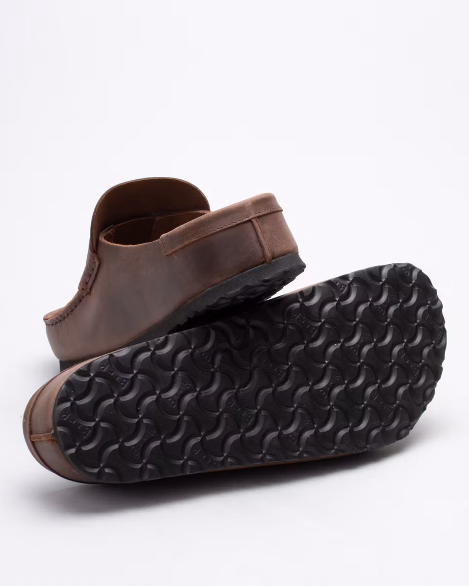 Täckt sandal med mockasin-tå från Birkenstock. Ovandel i mörkbrunt, oljat läder. Fast, läderklädd fotbädd i kork. Normal läst. Tillverkad i Tyskland.