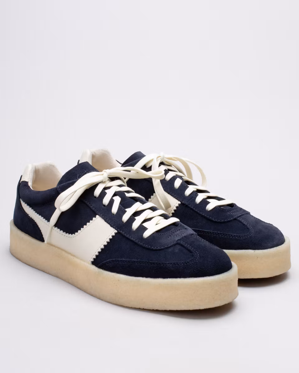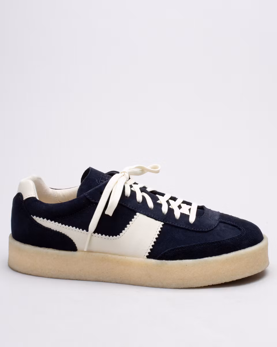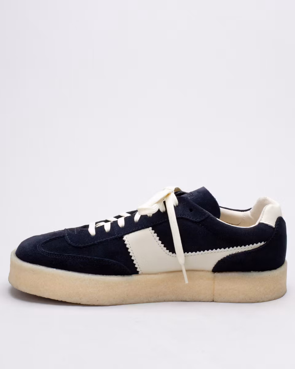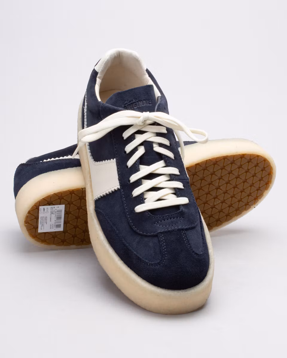 Tennissko-inspirerad sneaker från Clarks Originals. Ovandel i en kombination av navyfärgad mocka och vitt skinn. Ofodrad. Innersula i läder. Yttersula i gummi med rågummi-list.