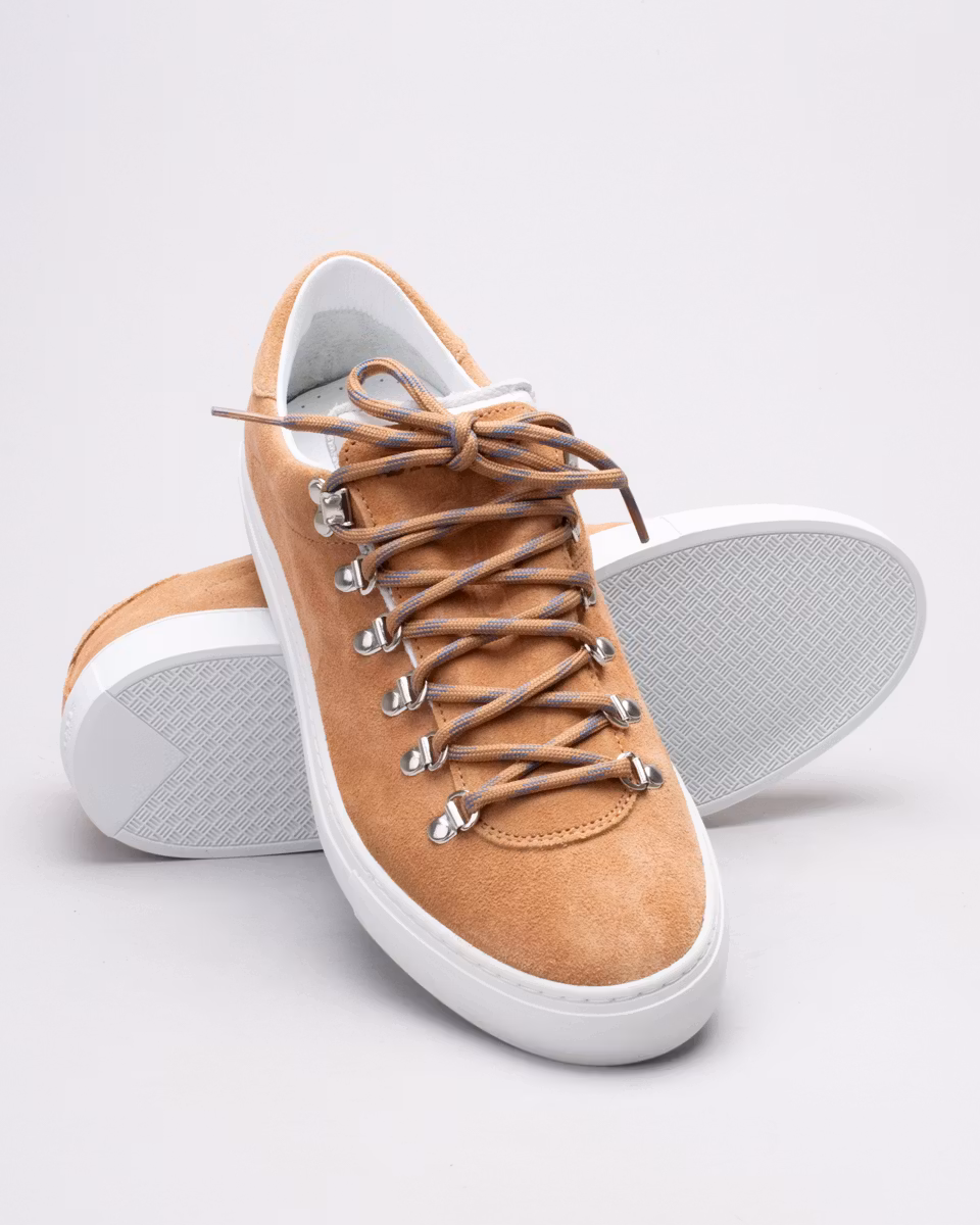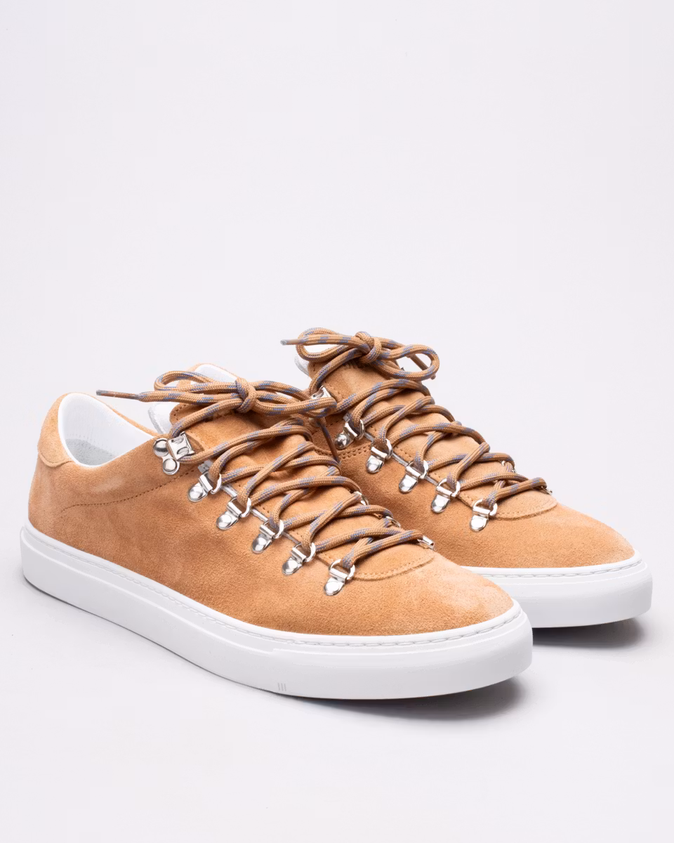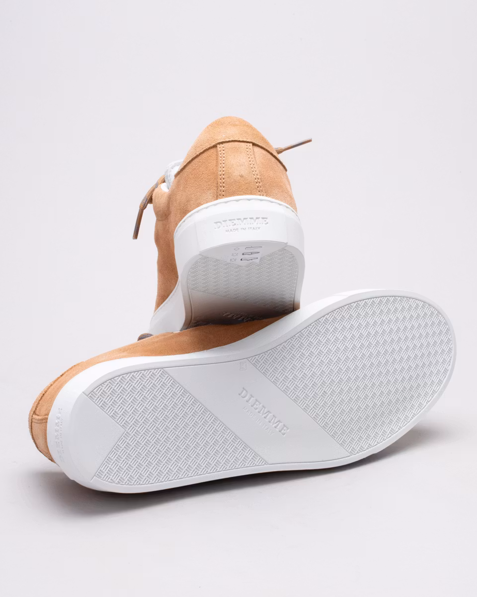 Diemmes tennisskosiluett med inspiration från klassiska hikingskor. Ovandel i beige mocka. Fullt skinnfodrade. Löstagbar, läderklädd innersula. Yttersula i gummi från Margom. Tillverkade i Italien.