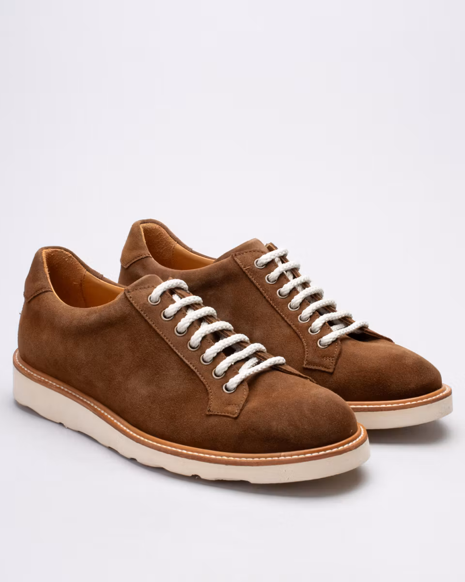 Sneaker-hybrid från Fiddler. Ovandel i brun mocka. Fullt skinnfodrad. Innersula i läder. Morflex, lättviktsgummisula från Vibram. Cementerad konstruktion. Tillverkad i Spanien.