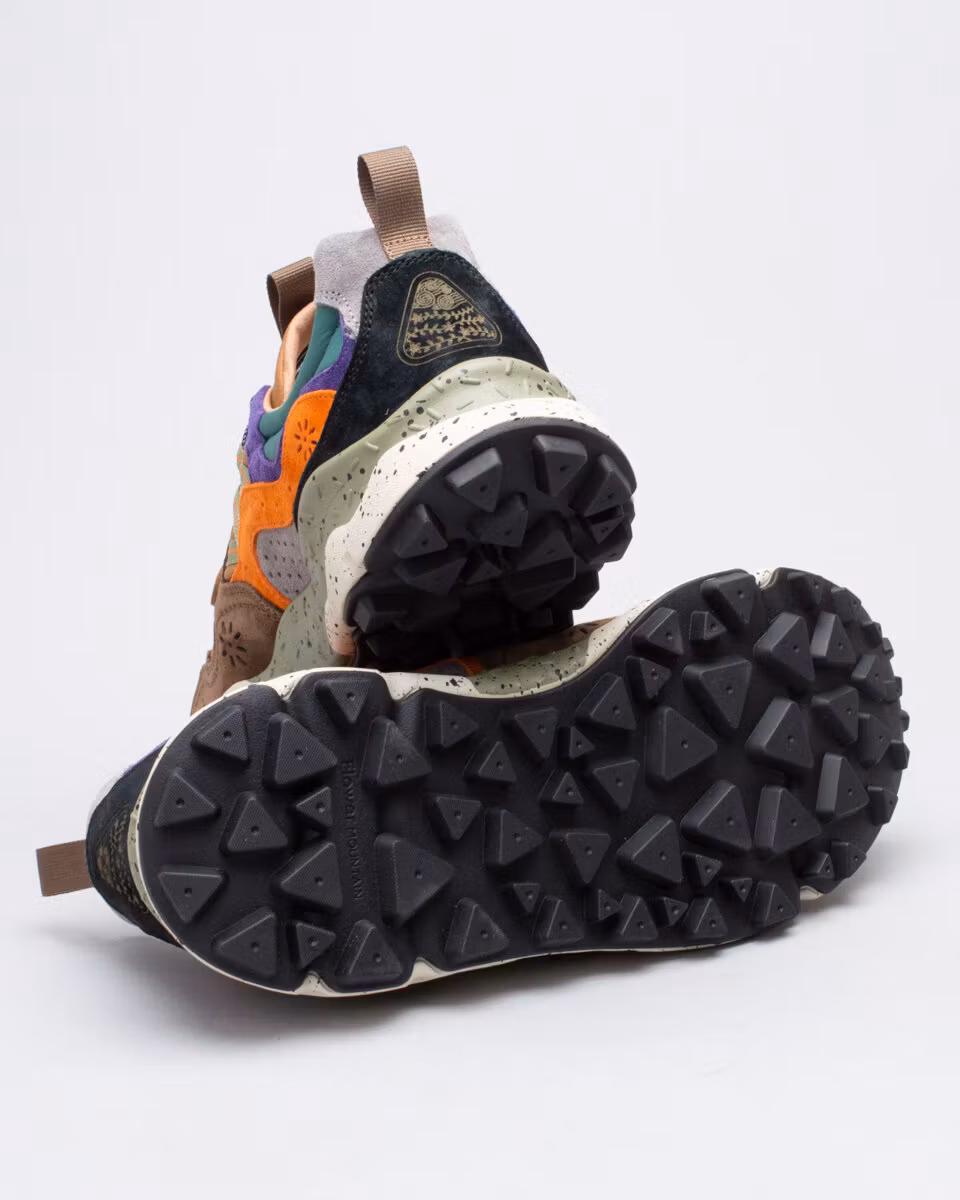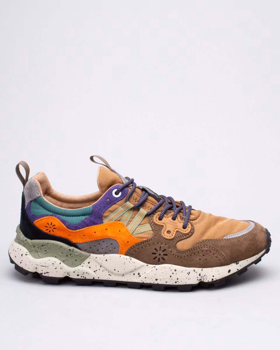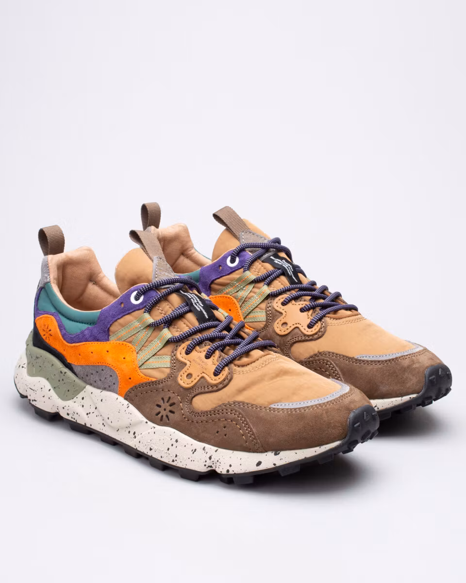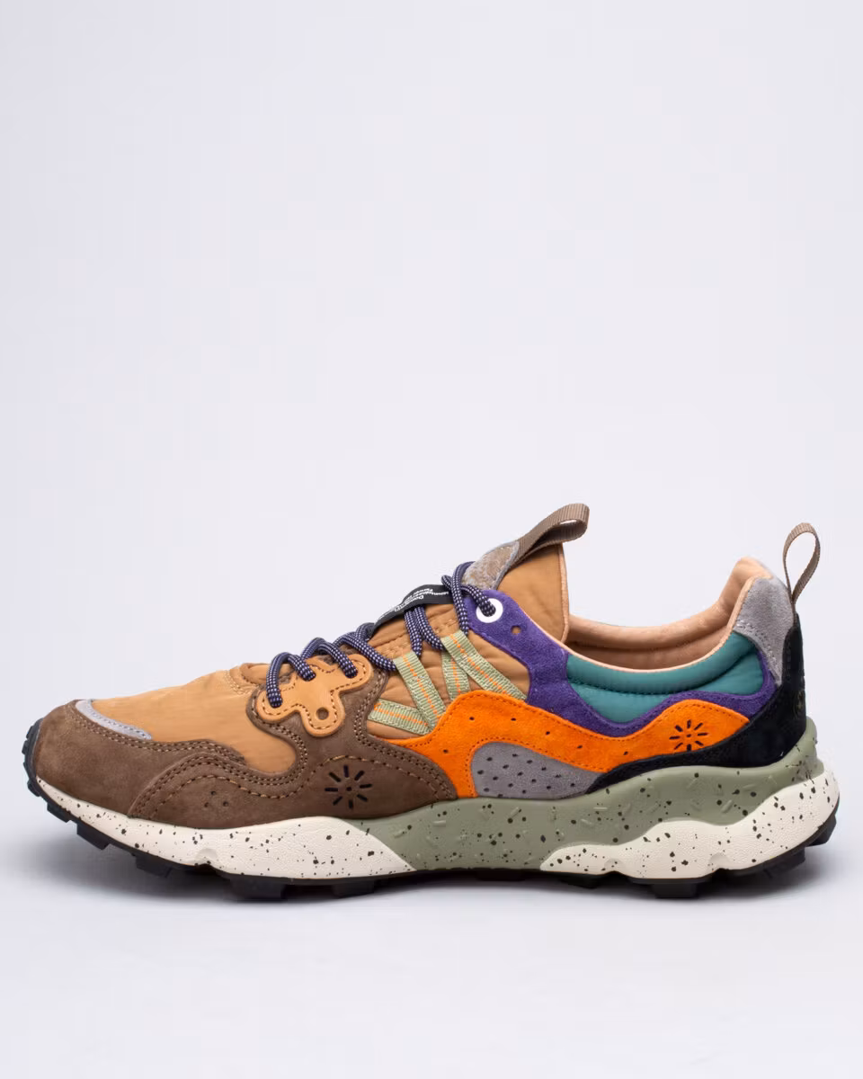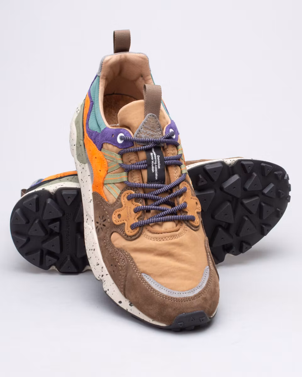 Sportig och outdoor-inspirerad, Yamano-sneakern från japanska Flower Mountain kombinerar aktiva detaljer med en stilig estetik: perfekt även för staden. Den tekniska ovandelen i tyg har mockadetaljer med den karakteristiska överlappande konstruktionen, trekkingsnören och blomformade detaljer. Grovmönstrad yttersula i lättviktsgummi. Den antibakteriella innersulan i naturlig kork skyddar foten och ger komfort hela dagen.