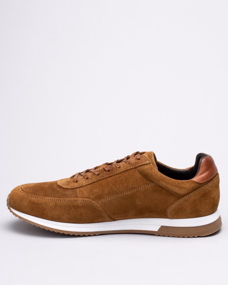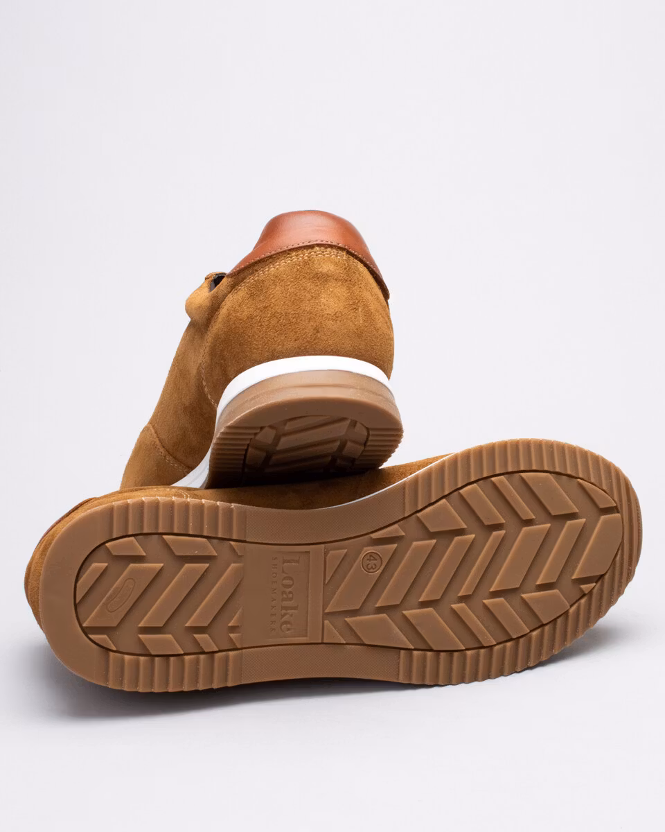 Klassisk löparskosiluett från engelska Loake. Ovandel i ljusbrun kvalitetsmocka. Fullt skinnfodrad. Löstagbar, läderklädd, innersula. Yttersula i gummi. Normalbred läst, F.