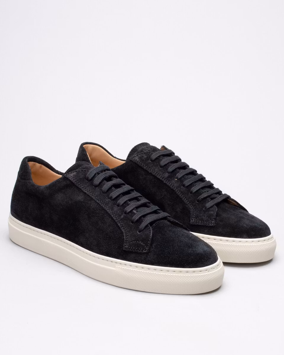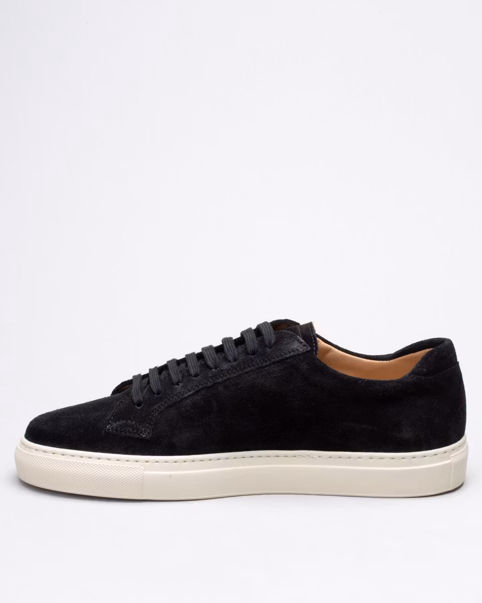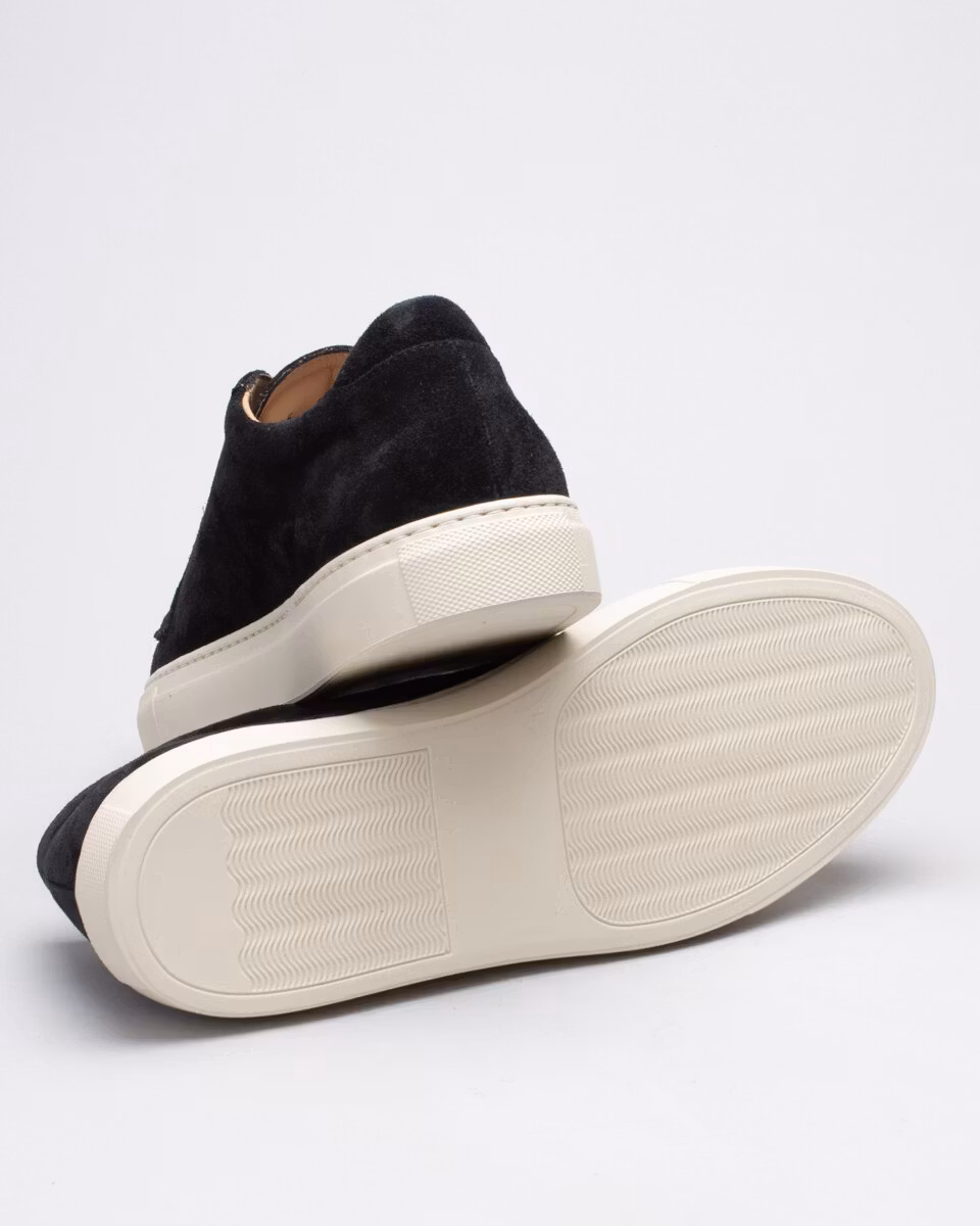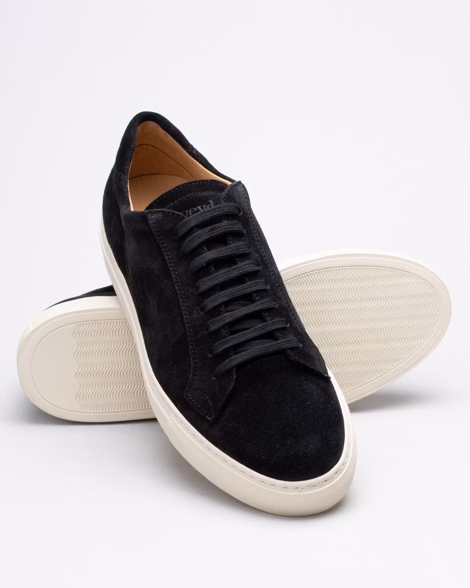 Klassisk tenniskosiluett från svenska Sweyd. Ovandel i svart mocka. Fullt skinnfodrad. Löstagbar, skinnklädd, innersula. Läderbindsula. Yttersula i gummi från Margom. Tillverkad i Italien.
