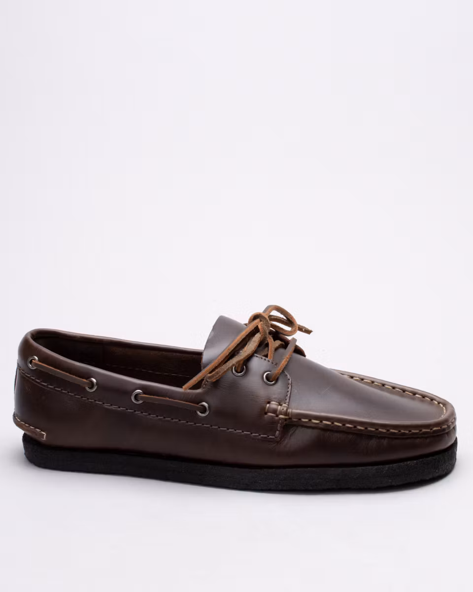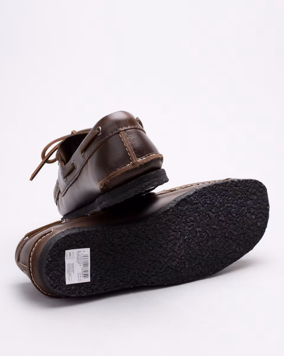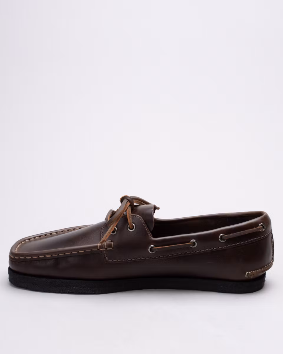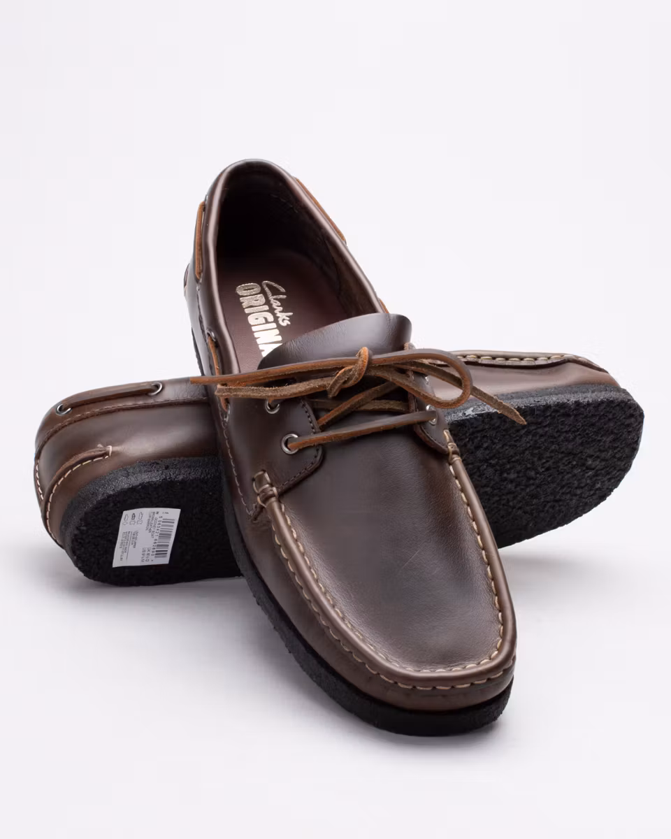 Clarks tolkning av seglarskon med tydliga referenser till Wallabeen. Ofodrad ovandel i mörkbrunt läder. Innersula i läder. Yttersula i rågummi. Handsydd apron-söm. Läderremmar.