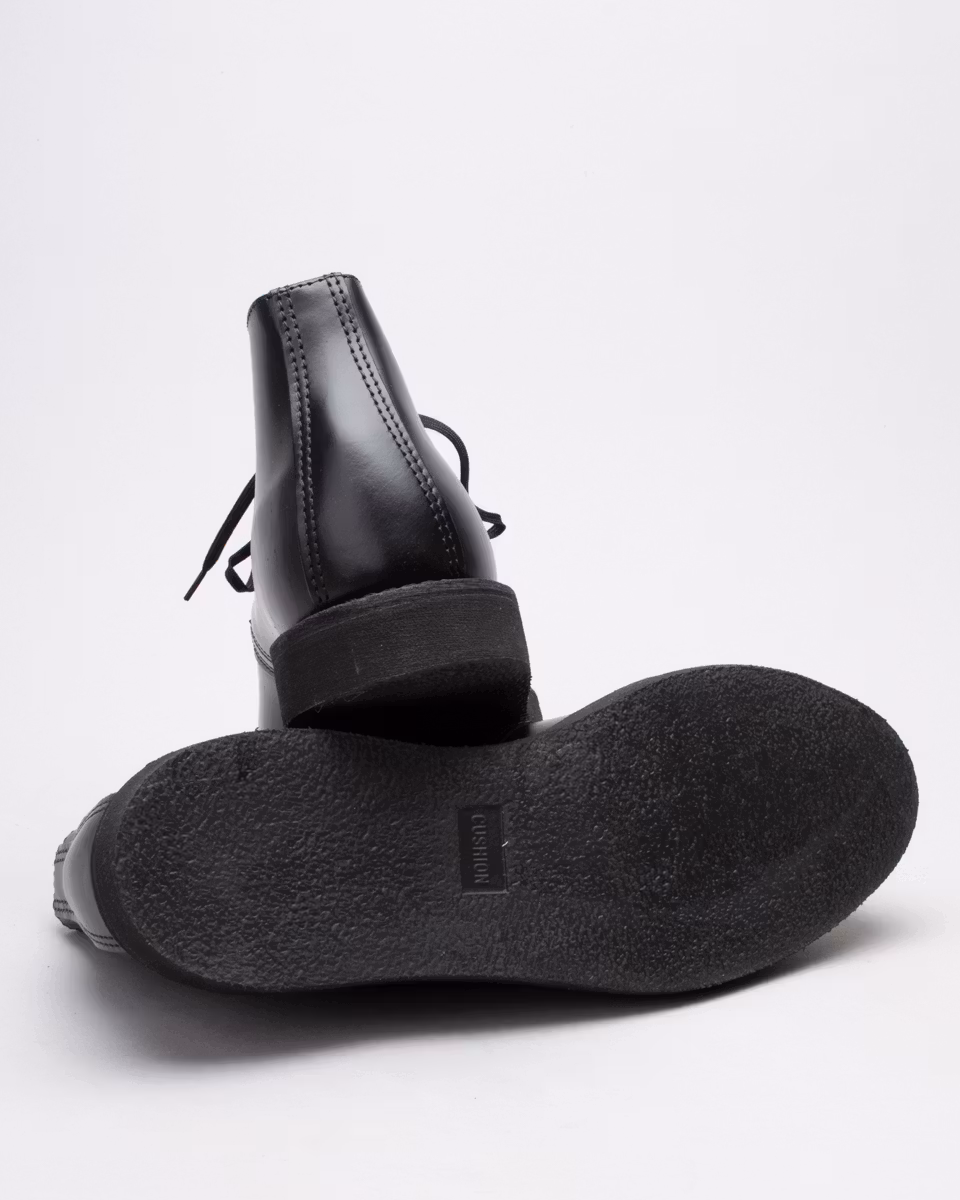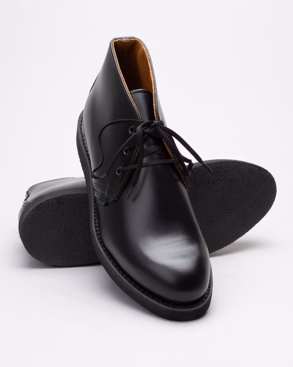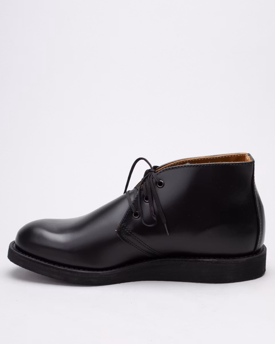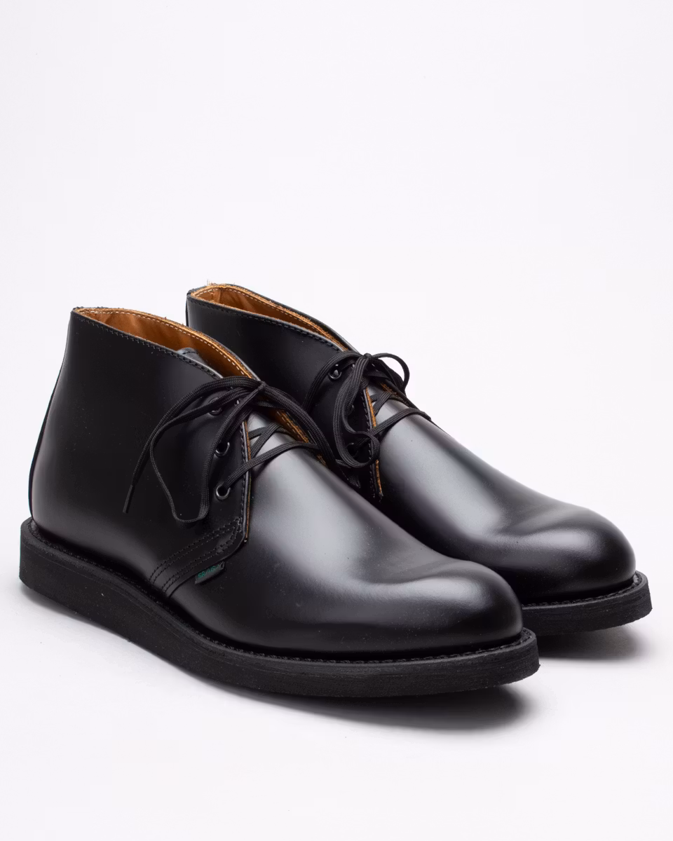 Red Wing Shoes Chukka 9196 lanserades första gången 1958 och var en hög variant av den äldre Postman-skon. Chukkan kallades för "Policeman" när den introducerades för att den riktades främst mot uniformerade yrkesgrupper som behövde in stilig och hållbar sko. Ovandel i svart Chaparral leather från SB Foot Tannery. Skinnfodrad. Innersula i läder. Yttersula i gummi. Randsydd konstruktion. Normalbred läst (D). Tillverkad i Red Wing, USA.